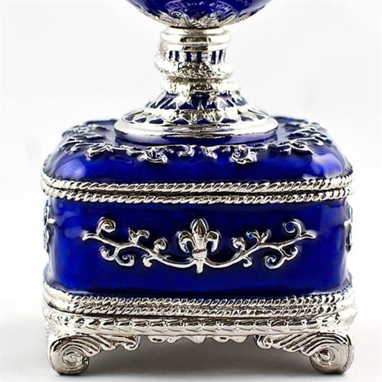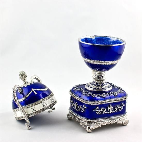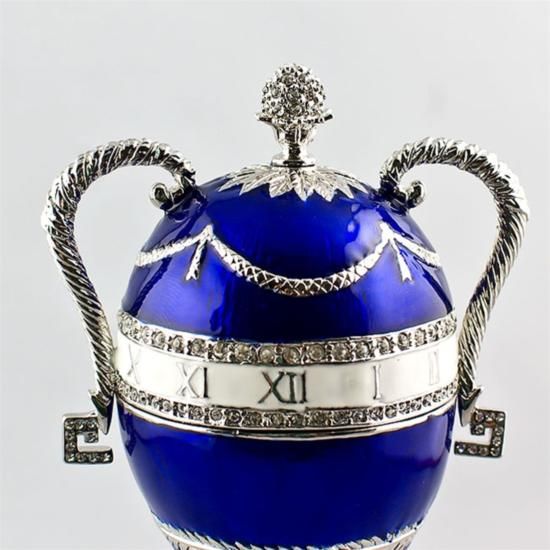 Blue Serpent Clock Faberge Egg, Dimensions: 6in (H) X 2in (W), Material: Pewter, Enamel, Crystals, The Blue Serpent Clock Egg is made of varicolored gold, diamonds and translucent royal blue and opalescent white enamel. Designed as a clock in the S?vres tradition, this Egg is a beautiful example of Faberge's use of the quatre couleur technique in gold. Around the shaft supporting the Egg, a diamond-set serpent is coiled, the head and tongue pointing to the hour. The famed Faberge eggs are jeweled eggs, often with the most ornate, minuscule designs on them. The House of Faberge made the original pieces from 1885 to 1917. At that time, they became popular gifts given during the Easter season. Larger versions were made for the Russian royal family, including Alexander III and Nicolas II. Of these, 42 of the 50 originals exist today. Most Faberge eggs, though, were much smaller and hung from a chain around the neck. These eggs have precious metals on them or gemstone decorations, often with intricate detailing. These are a symbol of luxury and thought of as individual masterpieces.