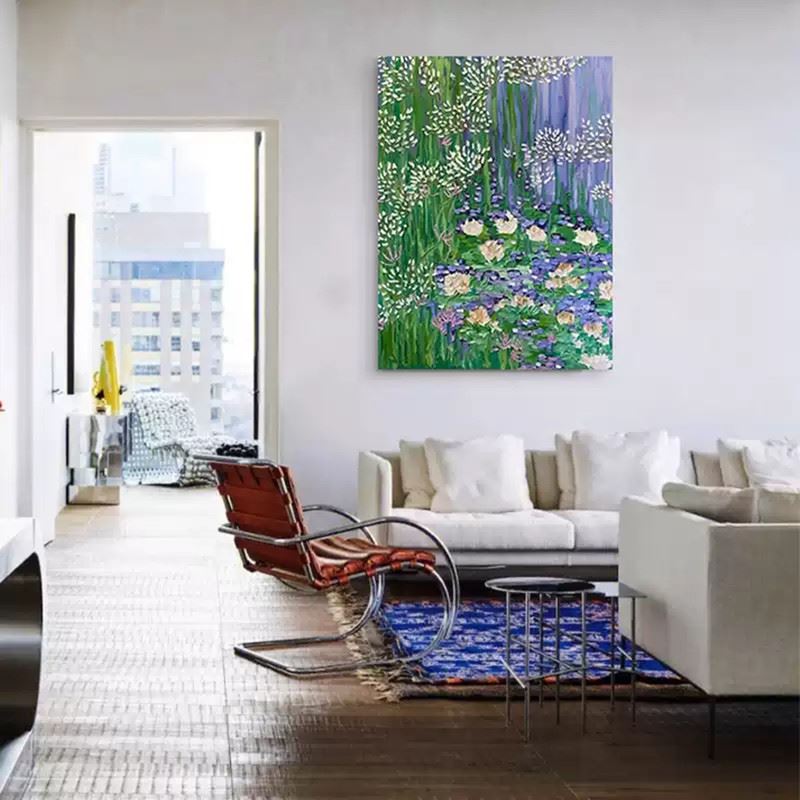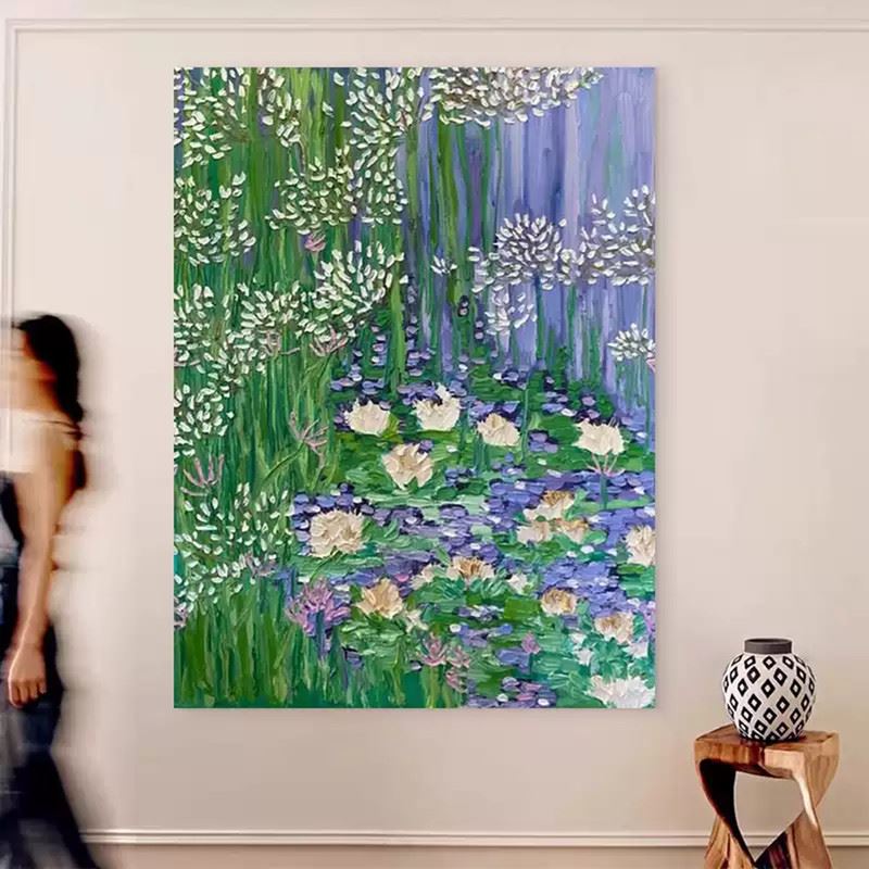 On the tranquil lake's surface, a few budding lotus flowers gently sway, surrounded by faint blue shadows, as if a dreamlike water world reflects the serene poetry of the scene. White lotuses and purple water plants intertwine, creating a soft and beautiful tableau, as though each flower whispers secrets of peace and the soul. Dimensions: 24 x 31 inches.
