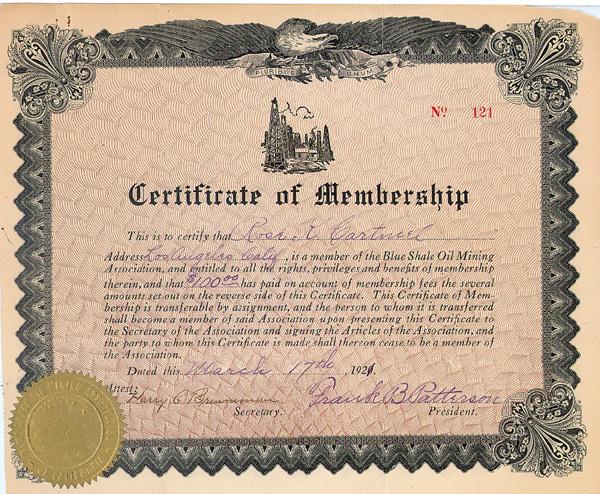1921, California. Certificate of Membership for the Blue Shale Oil Mining Association. Black on light brown paper. Spread eagle within the top center margin with a small oil derrick vignette directly below. Uncancelled.
