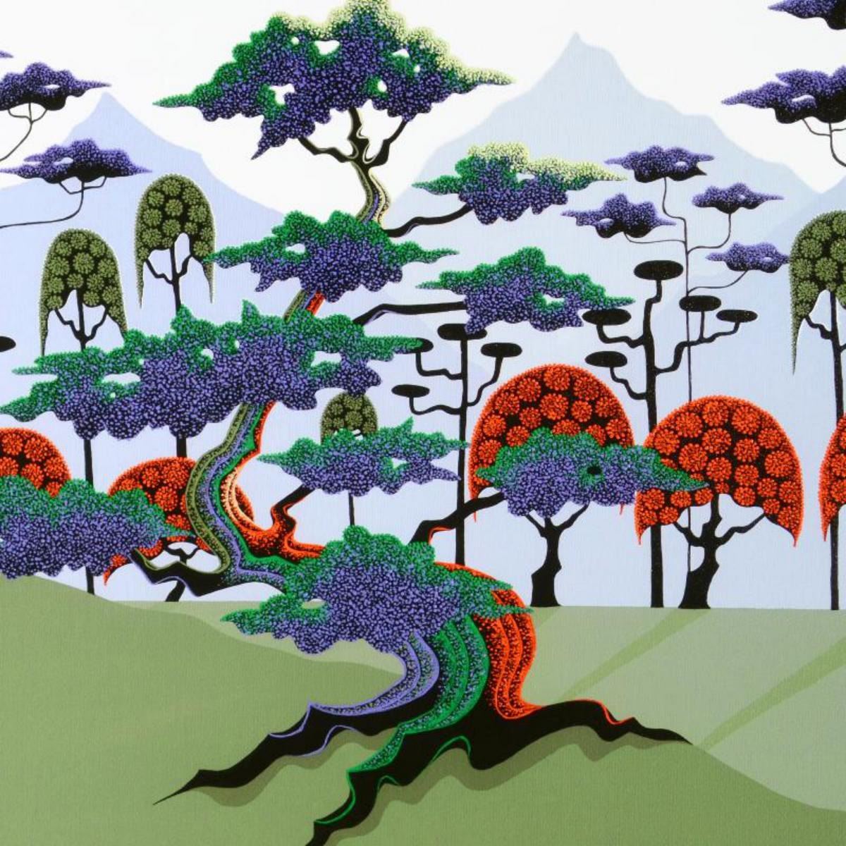Larissa Holt, a student of distinguished artist Eyvind Earle(1916-2000), uses bold colors and breathtaking scenery to create images of Nature in her own unique style. "Blue Sisters" is a limited edition giclee on stretched canvas by Holt, numbered and bearing Holt's authorized signature. This piece comes gallery wrapped. Includes Certificate of Authenticity! Measures approx. 27" x 22" x 1.5" (image). Reference #: 198723.