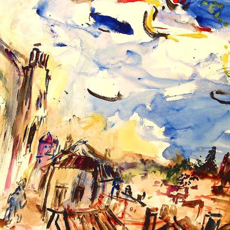 "Blue Skies Over St Emilion" is an original Watercolor on Paper by Wayne Ensrud. The piece is hand signed by the artist and comes with a Certificate of Authenticity. Measures approximately 20" x 29".