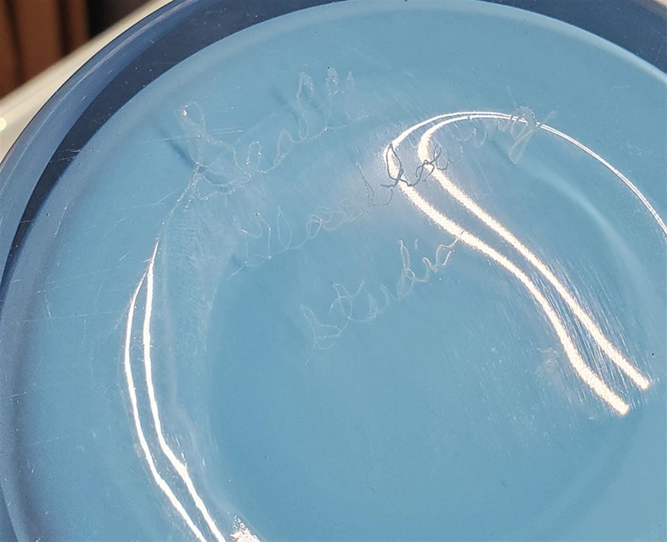 Blue colored fluted vase with brown speckles, this piece measures 14.25" tall and 15.75" diameter.