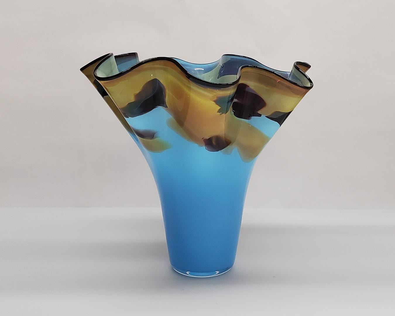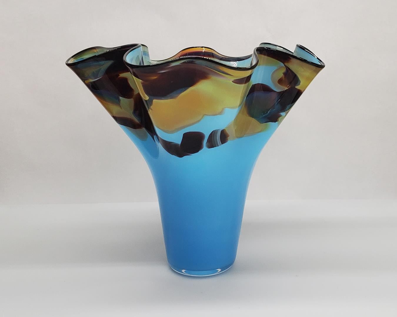 Blue colored fluted vase with brown speckles, this piece measures 14.25" tall and 15.75" diameter.