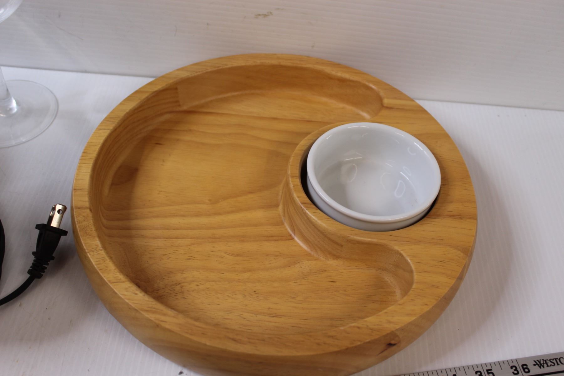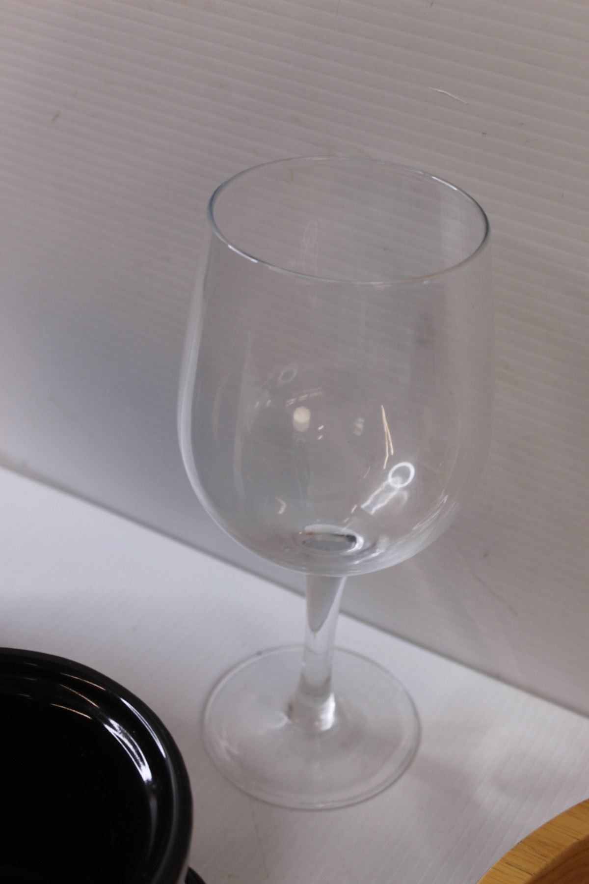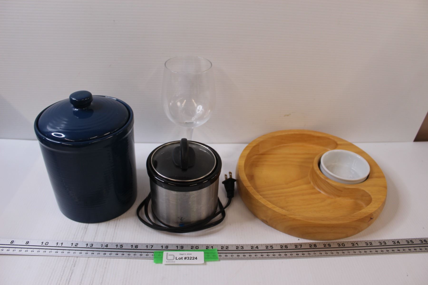 Blue Storage Crock, Wooden Chip & Dip Platter, Mini Crockpot, Extra Large Wine Glass