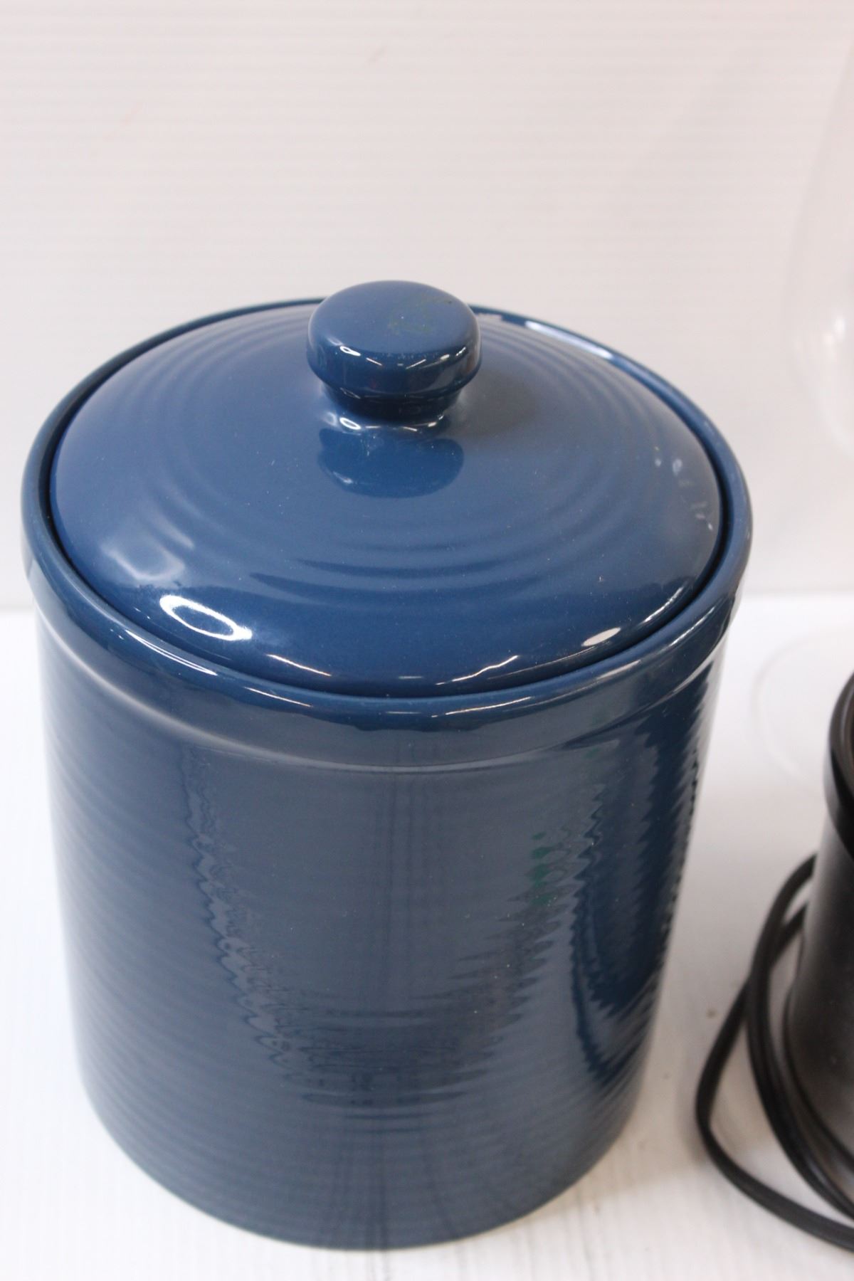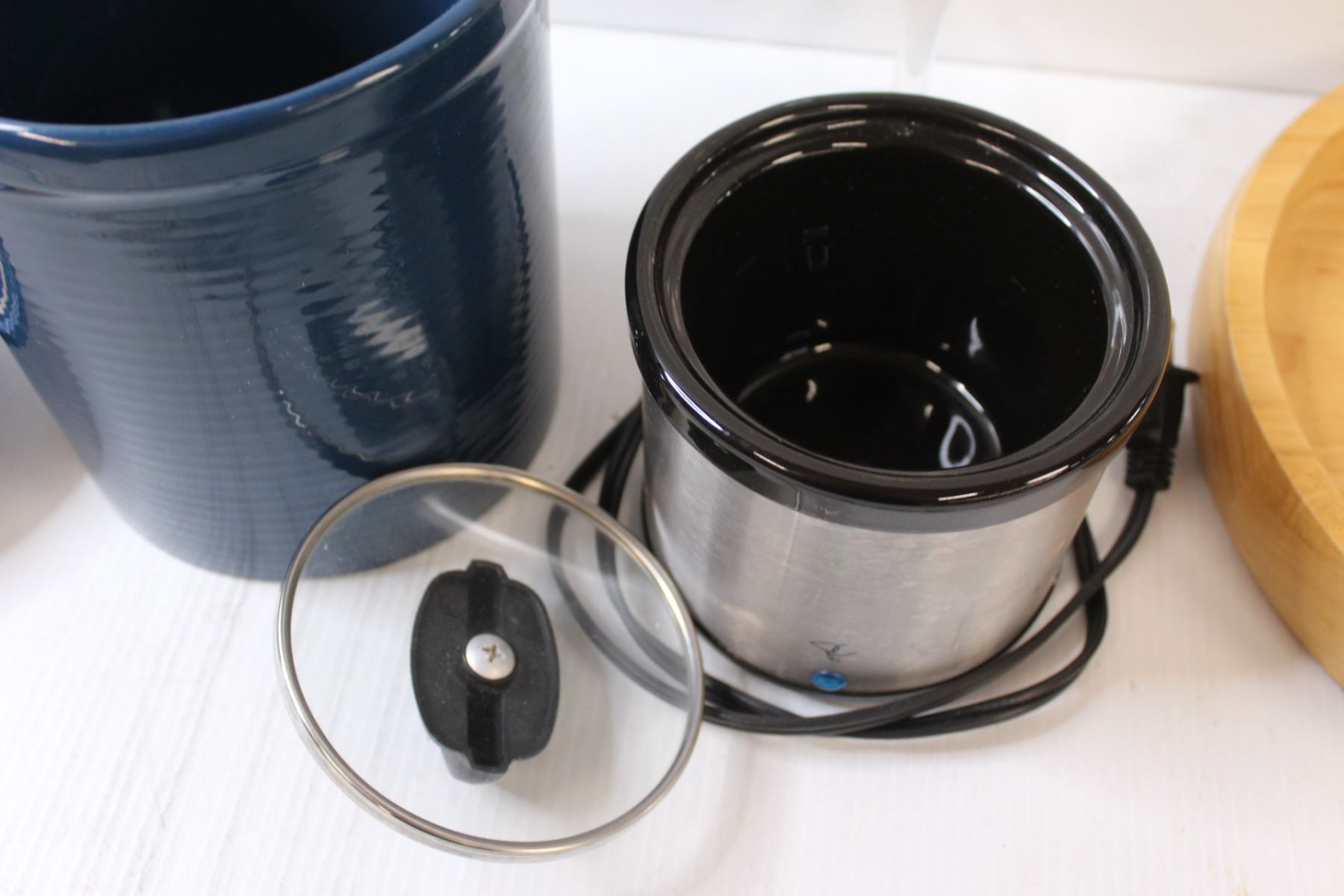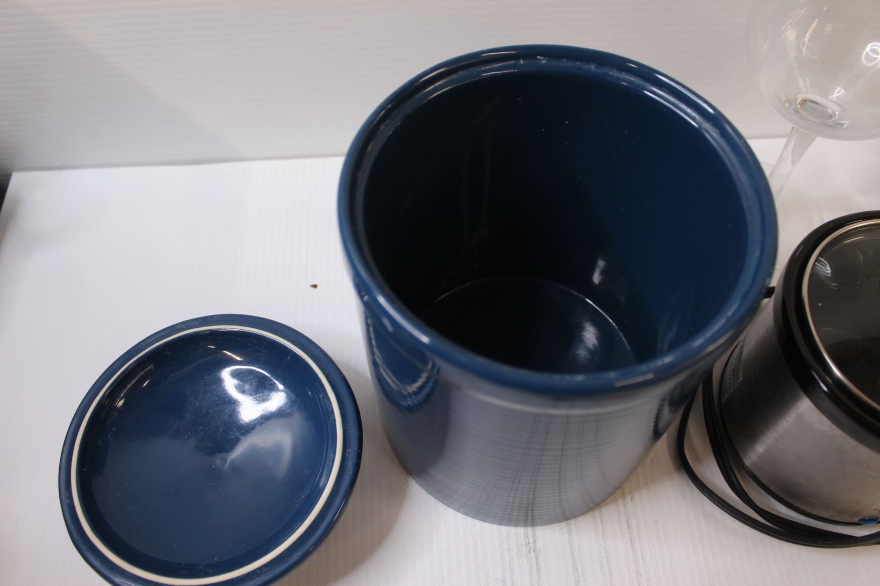 Blue Storage Crock, Wooden Chip & Dip Platter, Mini Crockpot, Extra Large Wine Glass