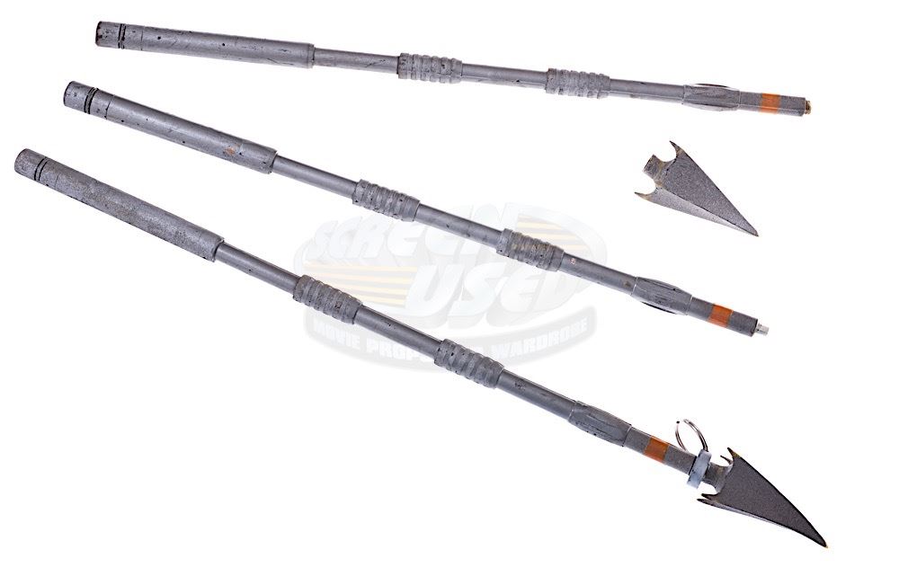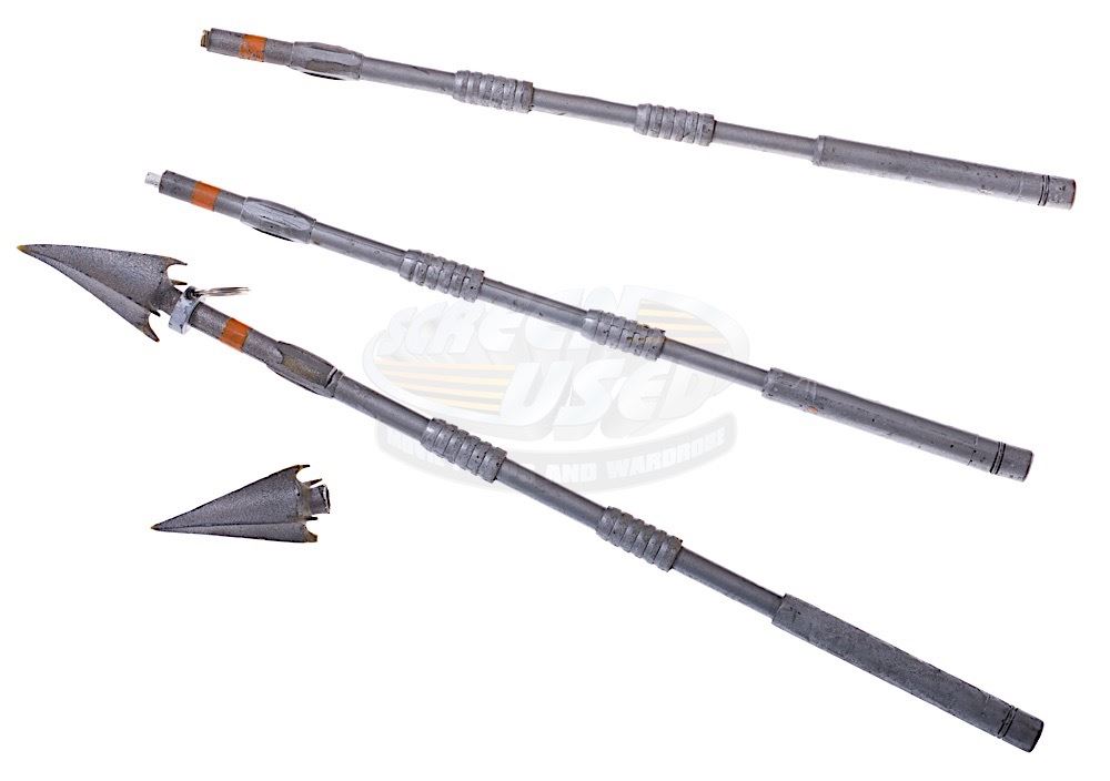 (Columbia Pictures, 1999) These prop spears and spear tip were custom-made by the production for use by various actors during filming. The spears are made of resin and painted silver and the spear tip is made of rubber. The spears and tip show signs consistent with use and storage. The spears measures 22.5" in length and the spear tip measures 3.5" in length.