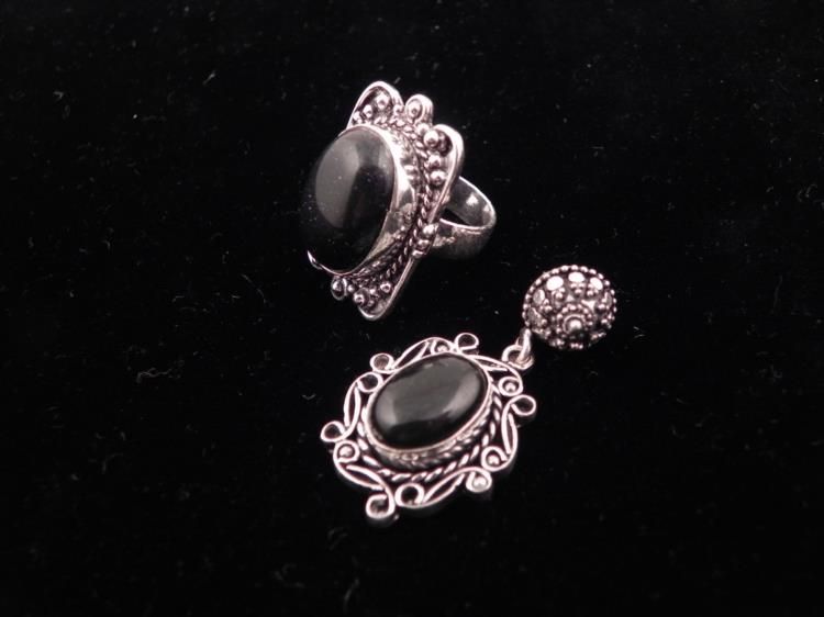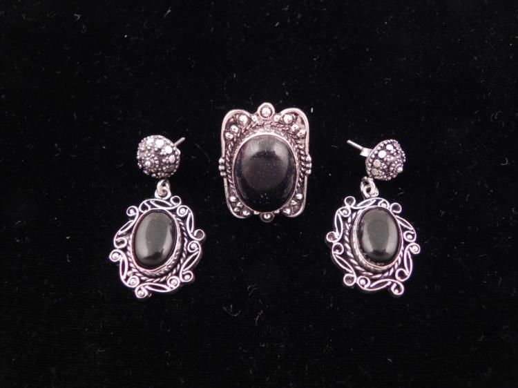 Ring & Earrings Set * Gemstones: Blue Sunstone (dark)Cut: Oval, smoothEarrings: 15 mm stones, in fancy design sterling setting, with fancy postsRing: 19 mm stone, in German Silver fancy design beaded and rope setting, size 6Condition: Excellent