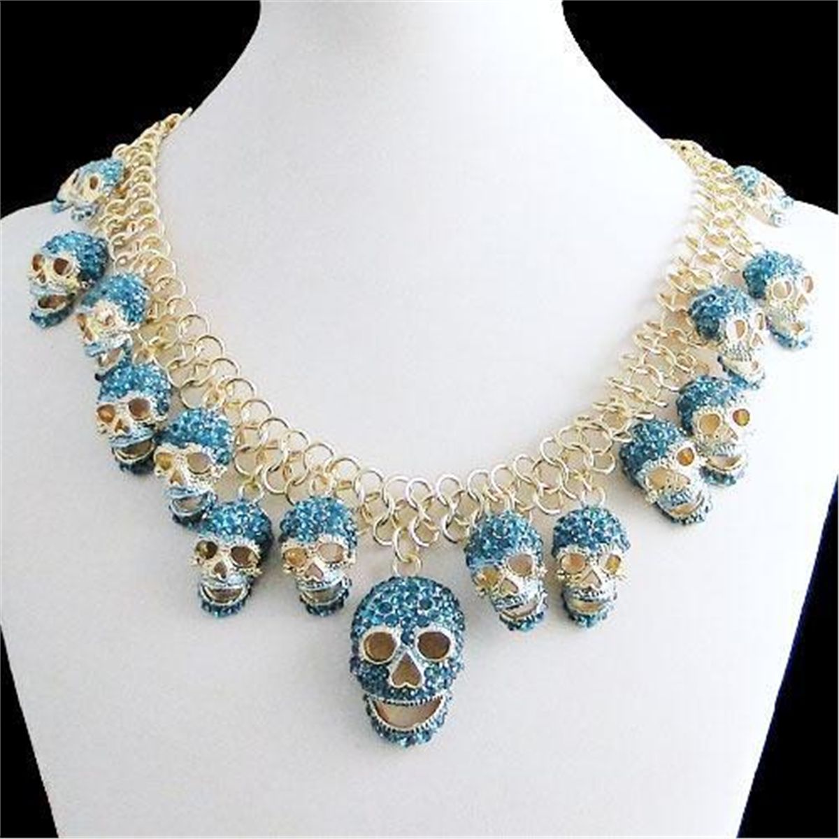 Blue Swarovski Crystal and Gold Tone Skull Pendant Necklace, measures approx 20 inches mwf2313
