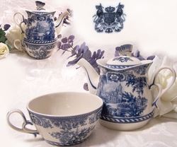 Tea 4 OneAdorned with a pretty blue floral design, this is a prefect collector's item! Such pretty detail and versatility in this tea for one pot and cup combination. A beautiful little butterfly adorns the lid. Made of porcelain and marked with an emblem on the underside, this pretty reproduction will be cherished for years to come. Measures 7" tall 4.5" dia.