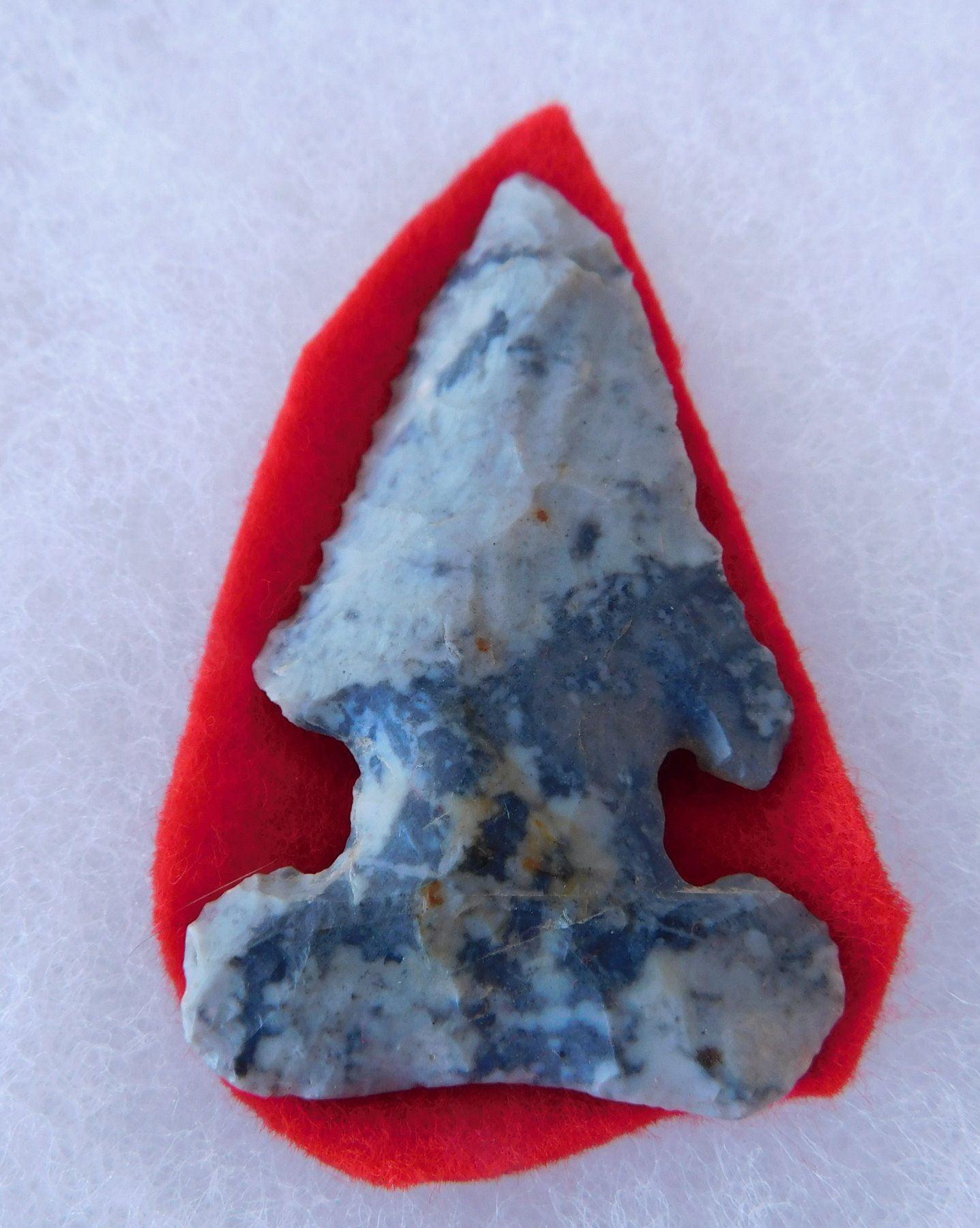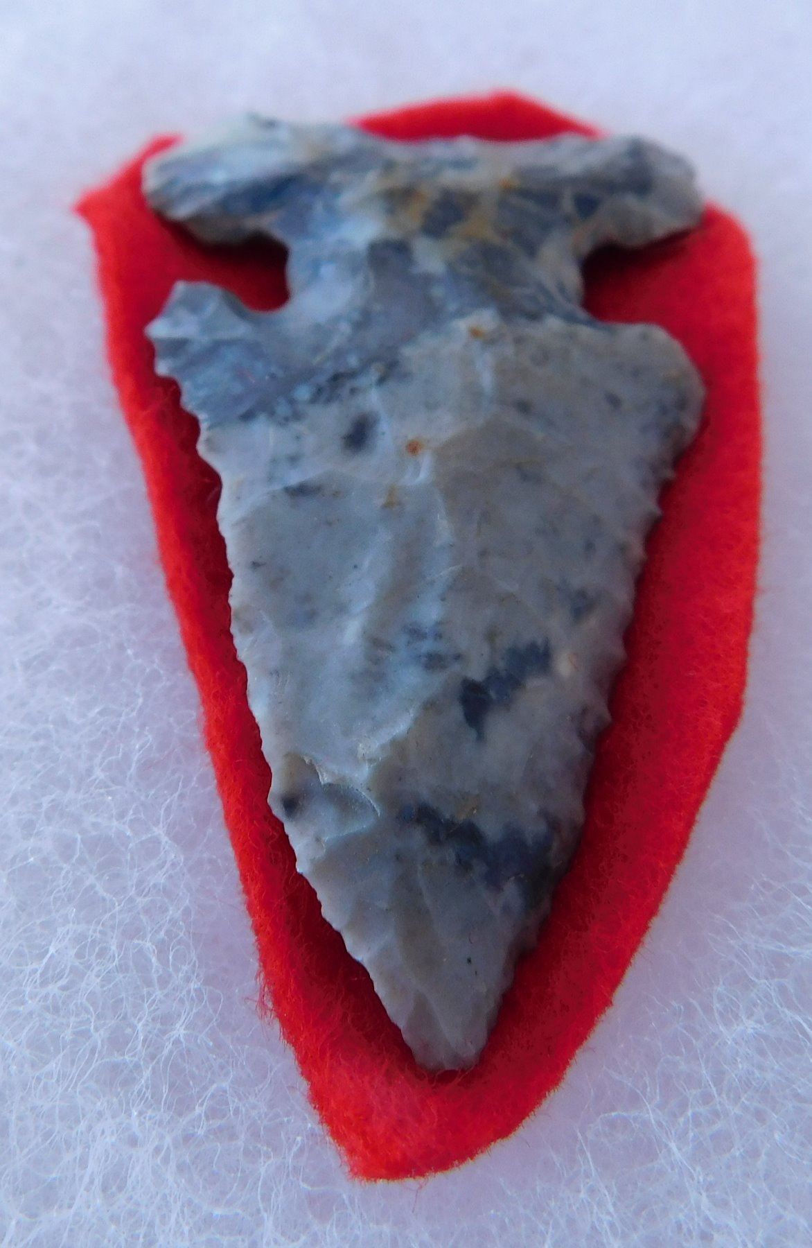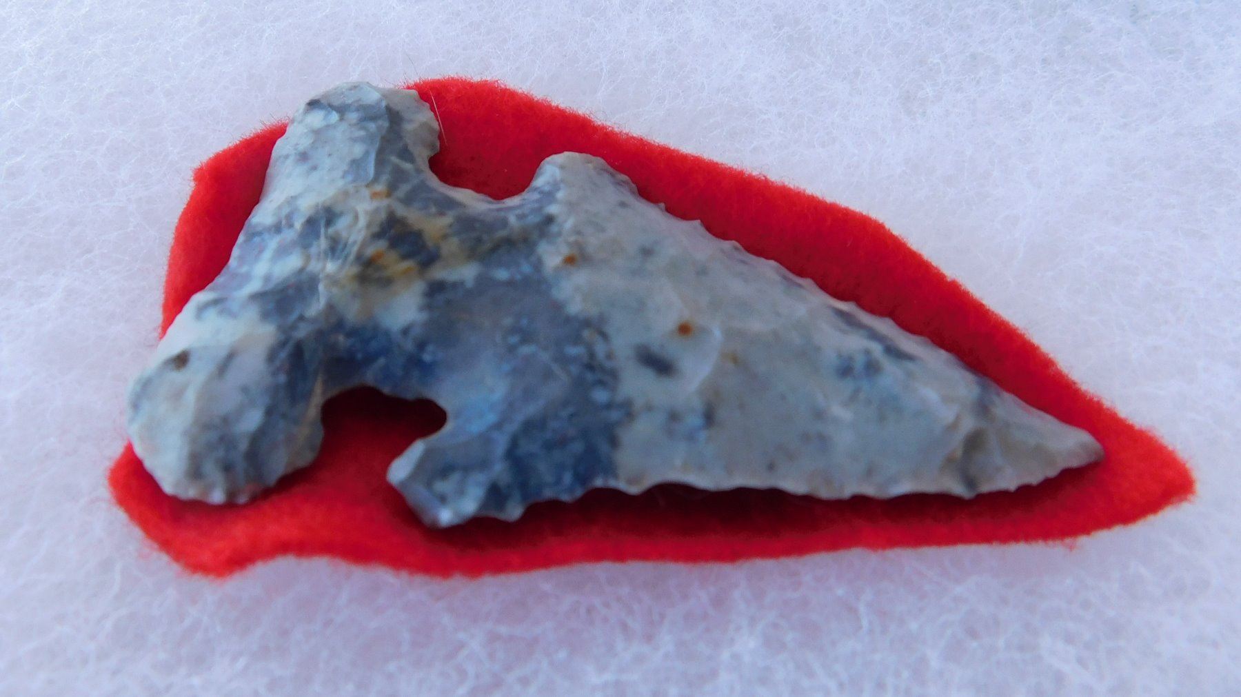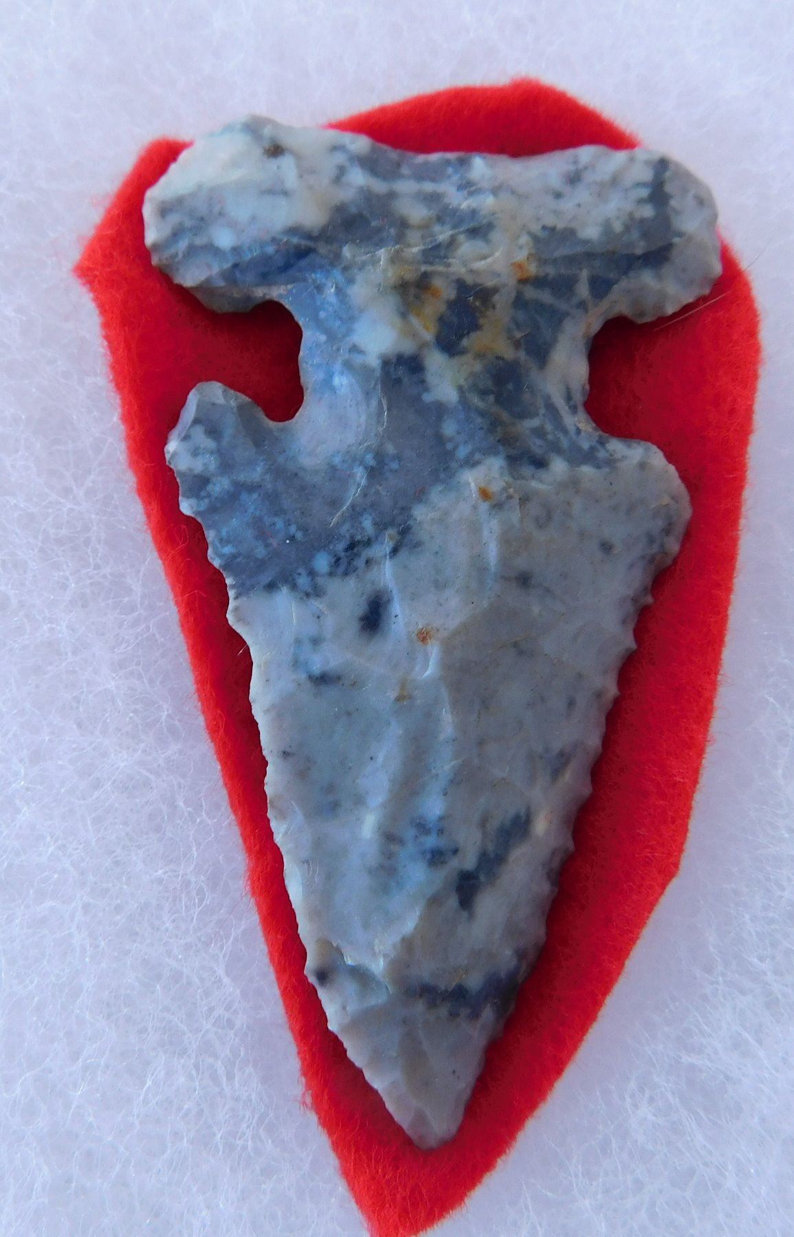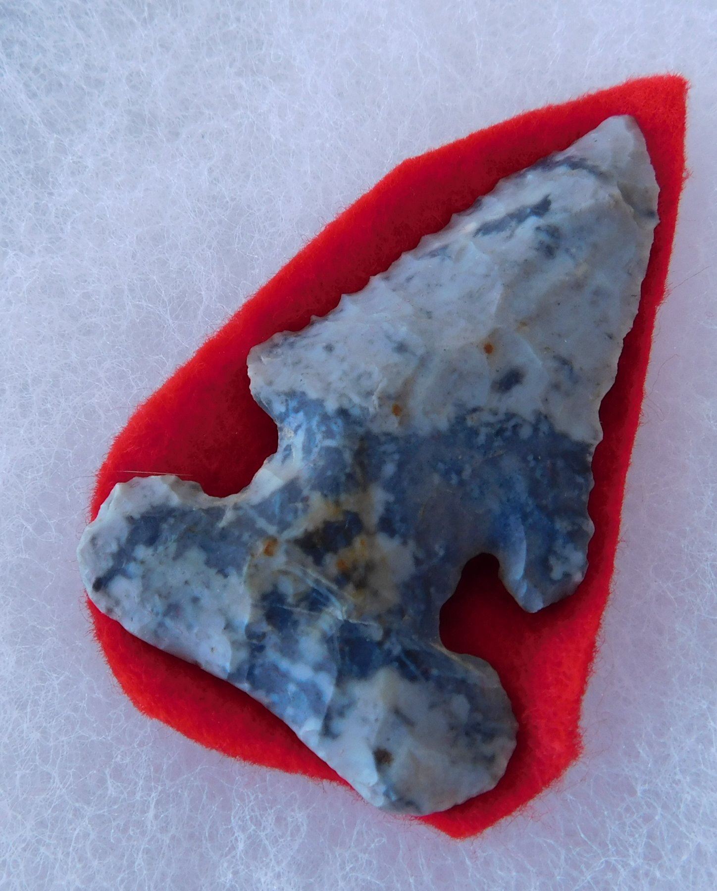 Blue Thebes Point w/Helm COA, pre-historic item. Made of flint ridge chert, the item measures 2 1/4". Ross County, Ohio. Helm Certificate of Authenticity. Frame not included. Condition: Barb ding, see images. Shipping: $12.50 w/insurance and signature.