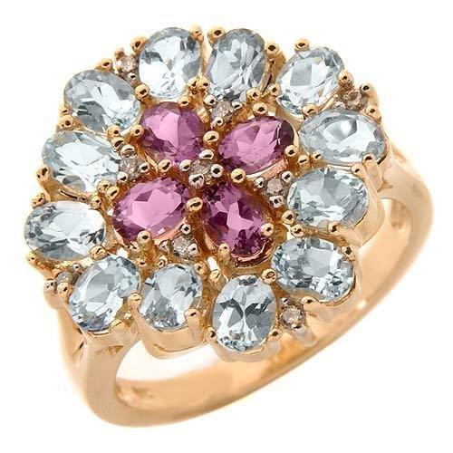 Size 7---Twelve oval, 2.7ctw. sky blue topaz surround four oval, .70ctw. deep purple amethysts and nine round, .10ctw diamonds in this 14kt. yellow gold ring. The stones are prong set.