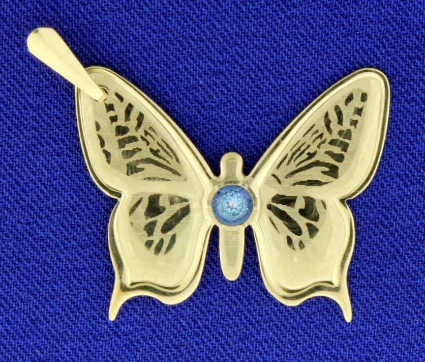 Quite unique! This 14k yellow gold Butterfly pendant has a beautiful round Blue Topaz center gemstone. The pendant is 1 1/2" long. 2.4g