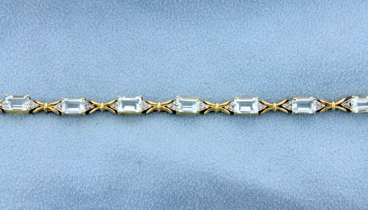 There are 12 emerald cut blue topaz 6mmx4mm, approx. 5 carats total weight. There are 1/4 carats of diamonds, clarity I1 and I-J colors. 7" in length. 7.6g