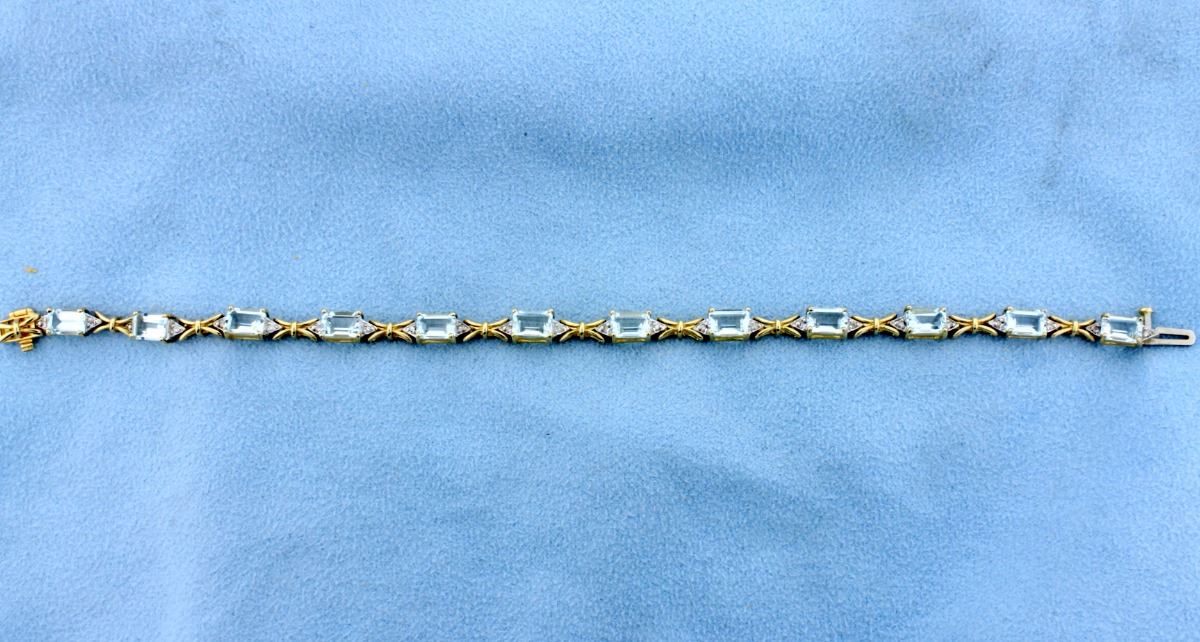 There are 12 emerald cut blue topaz 6mmx4mm, approx. 5 carats total weight. There are 1/4 carats of diamonds, clarity I1 and I-J colors. 7" in length. 7.6g