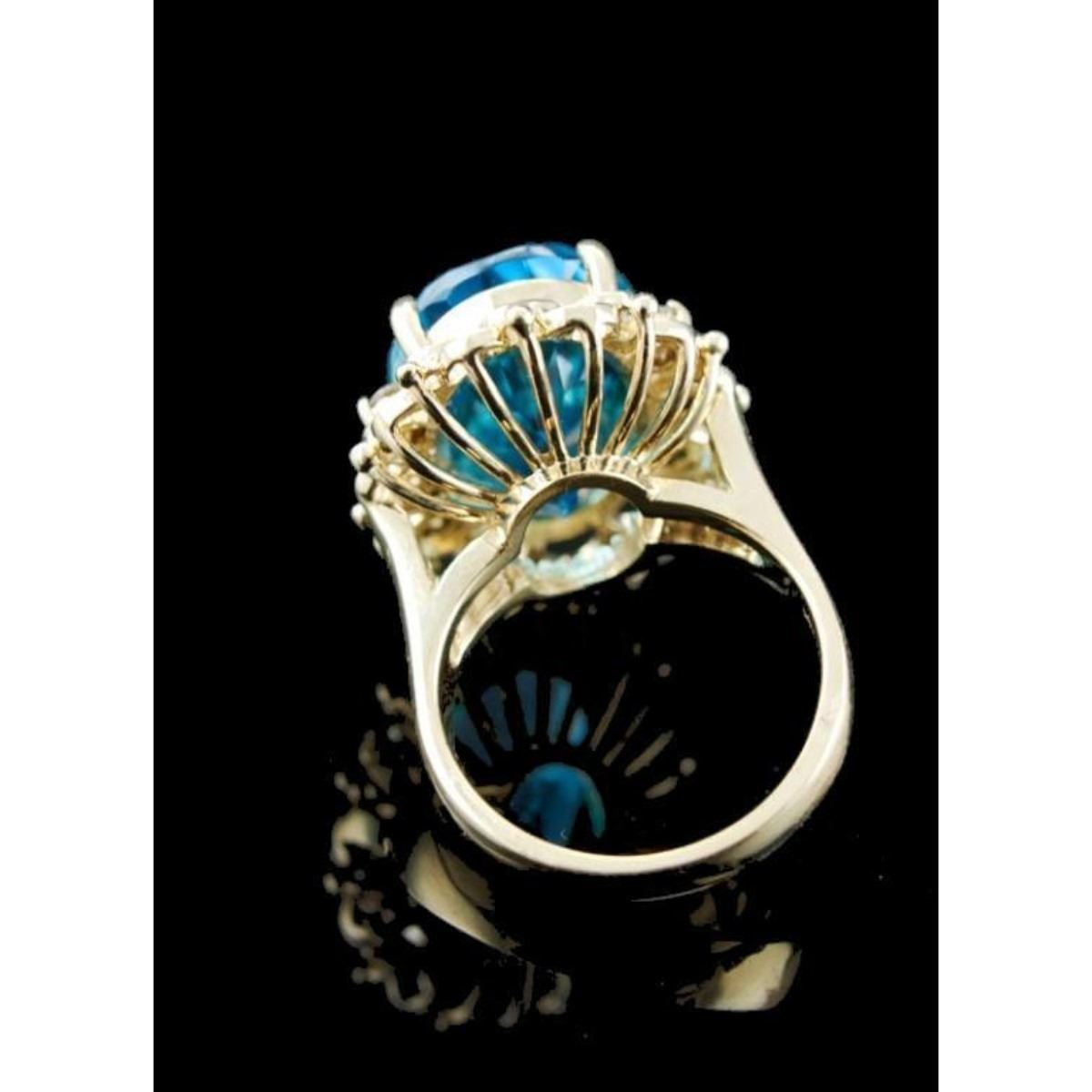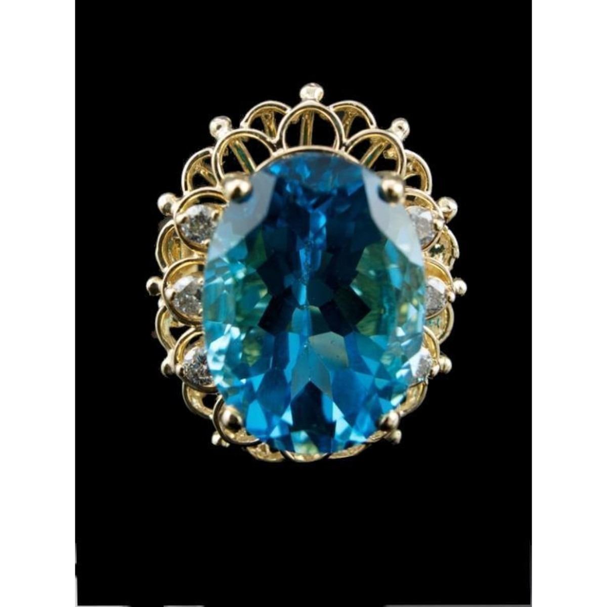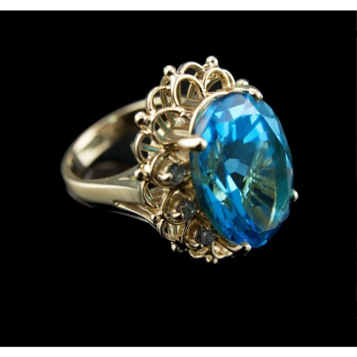 Large oval faceted blue topaz ( 12mm X 18mm, over 20cts ) with 6 small round diamonds set into a 14kt yellow gold ring. Size 6.5. Inside of band is stamped 14kt.