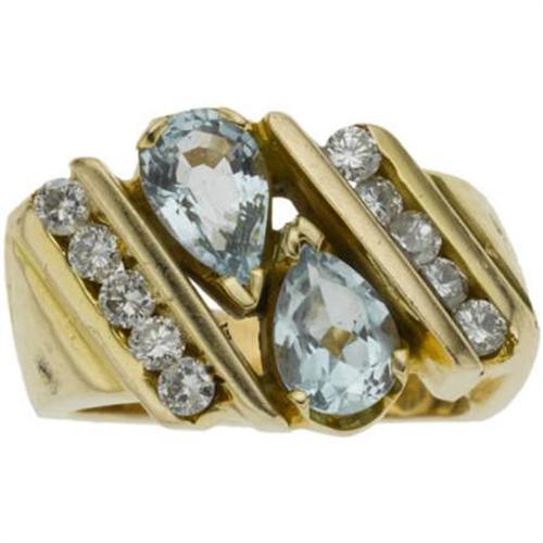 <B>Blue Topaz, Diamond, Gold Ring</B></I><BR><BR>The ring features pear-shaped blue topaz weighing a total of approximately 2.00 carats, accented by full-cut diamonds weighing a total of approximately 0.50 carat, set in 14k yellow gold. Gross weight 10.90 grams.<BR>Note: Size 5-3/4 (sizeable)<BR><BR> <B>Condition Report:</B> Good condition. Three of the diamonds are chipped.<BR><BR><b>Shipping:</b> Miscellaneous Collectibles, Smal (<a target="_blank" href="http://www.heritageauctions.com/common/shipping.php">view shipping information</a>)