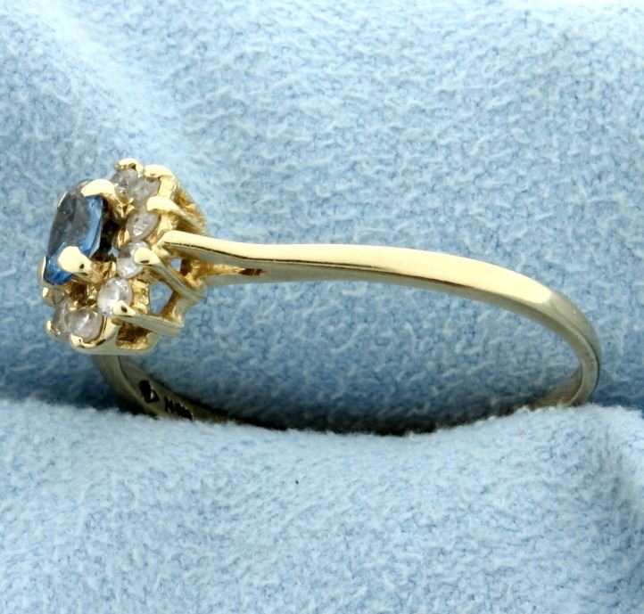 In 10K yellow gold the ring contains a 5x3mm oval blue topaz & ten .02ct diamonds. Size 10 1/2 1.8g