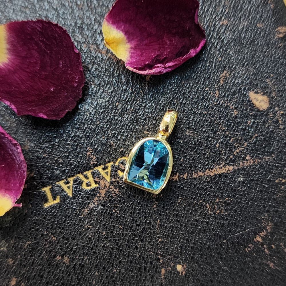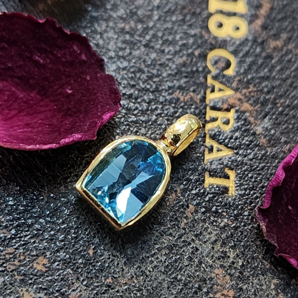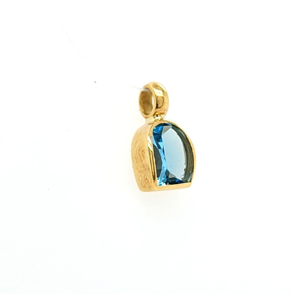 Genuine Blue Topaz Pendant.& nbsp; This is an 18 karat yellow gold horseshoe-shaped slide style pendant that features an approximate 9 mm x 7 mm Swiss Blue Topaz with a fancy-cut and sugarloaf-faceted top. This is a well-crafted item, with a smooth, polished finish and the horseshoe-shaped gold frame is approximately 1.2 mm thick& nbsp; The gemstone is bezel-set with a fixed jump ring/bail that has an approximate 3 mm opening.& nbsp; The pendant is approximately 3/8& quot; diameter.& nbsp; This is a preowned, estate item in excellent condition.