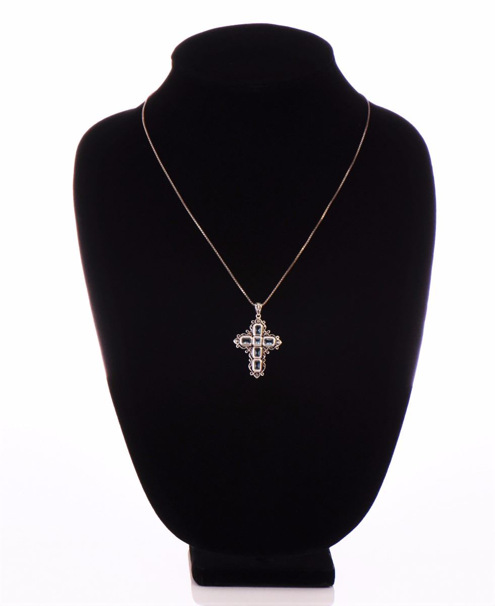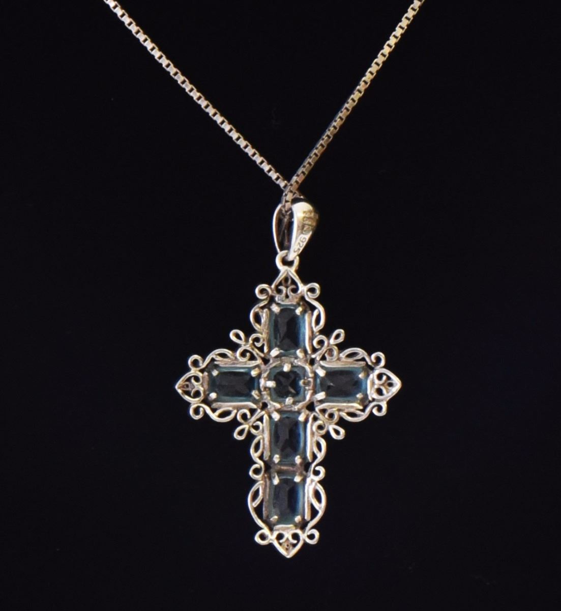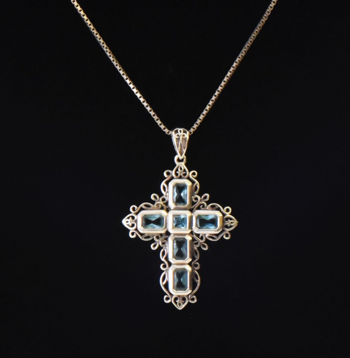 Blue Topaz Sterling Silver Cross Pendant and Chain, Stamped "Italy 925" Base Stand Not Included. Estimated more than 50 yrs old. 925 Sterling Silver consisting of 92.5% silver and 7.5% copper. Tested Positive using Nitric Acid Chemical Scratch Test, Cloth Rub Test, Smell Test, and Magnet Test. Markings of 925 or Sterling stamp. The reason silver needs to be combined with other metals is that it is very difficult to make great designs with just pure silver, which is very soft and malleable. A bit of hardness has to be introduced by adding other metals such as copper. That is why jewelers are capable of making the most intricate an complex designs with 925 Sterling Silver. Silver is one of the most valuable elements next to gold. Mexico is the leading producer of sliver, followed by the United States, Canada, Australia, Spain, Peru, and Russia. Many countries do not require their precious metal items to be stamped and therefore we test to ensure we accurately represent the product. Size: See Ruler Photo. (Photos Represent The Condition Of The Lot.)