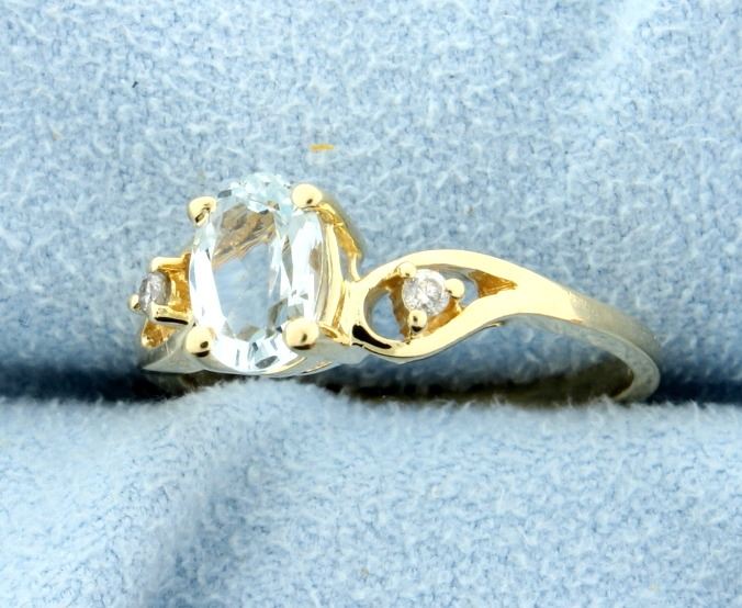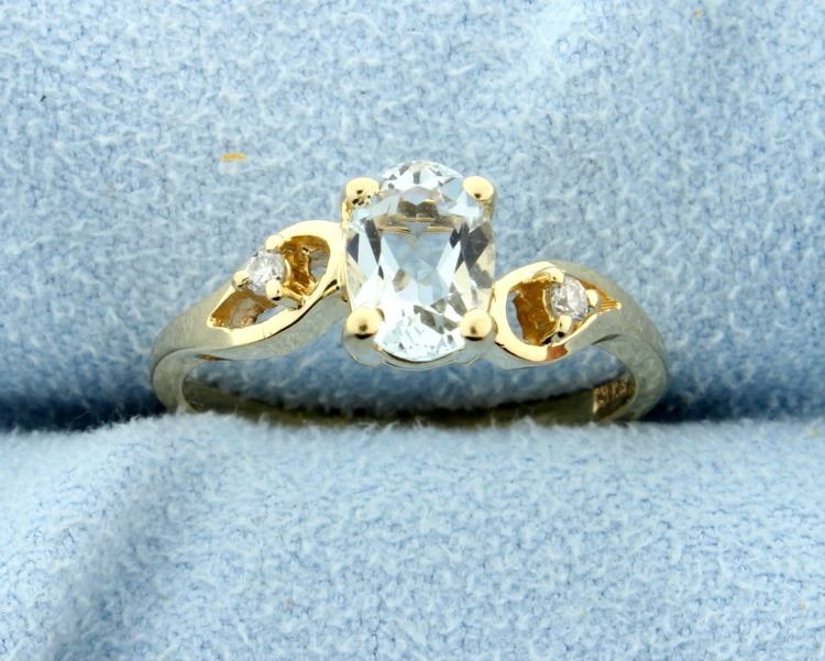 The sky blue topaz is oval and measures 7.12mmx5.04mm and is approx. 1 carat. There are 2 brilliant cut diamonds for a total of 0.03 carats. Size 6. 2.3g