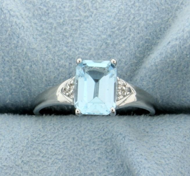 Contains 2 ct emerald cut Genuine Sky Blue Topaz gemstone accented with two one point diamonds. Ring is platinum over sterling silver. Size 7.25. 2.3g.