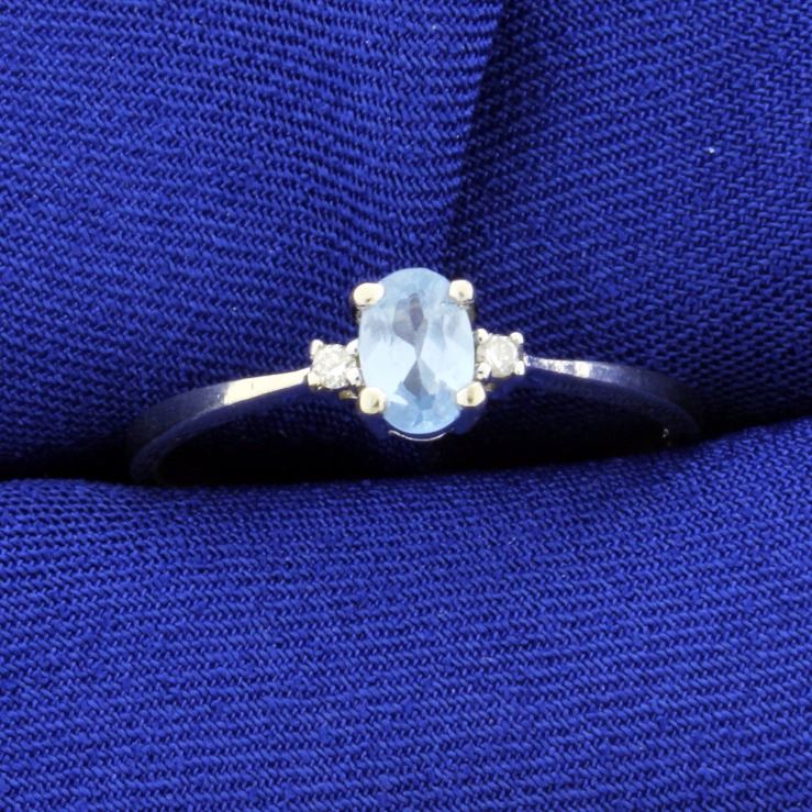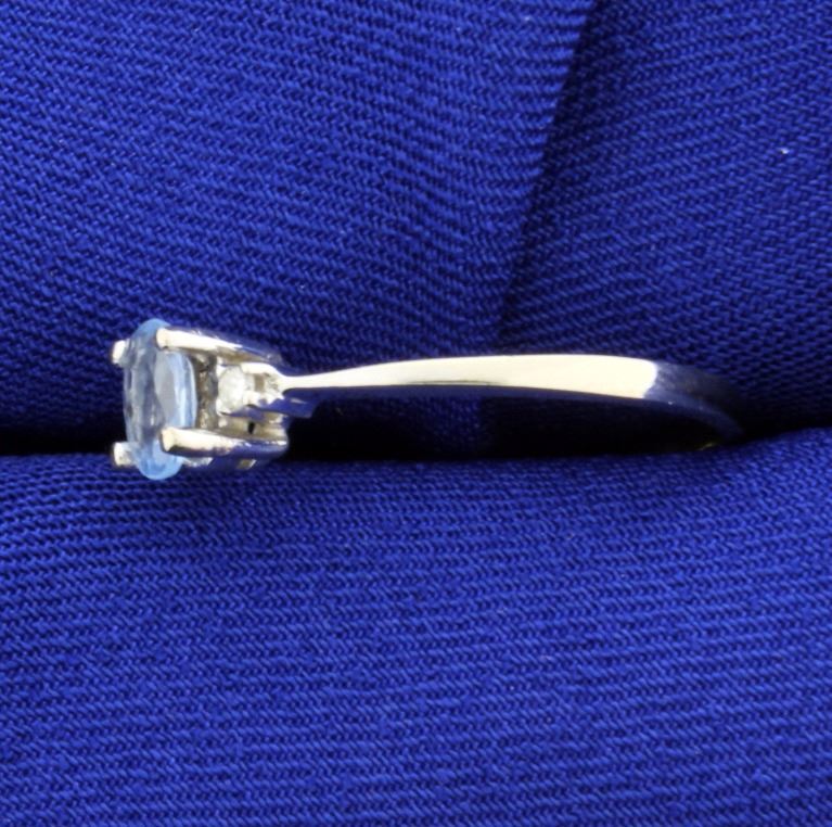 In 14k white gold this ring contains .5ct oval blue topaz with two .02ct round diamonds. Size 9 3/4 2.1g