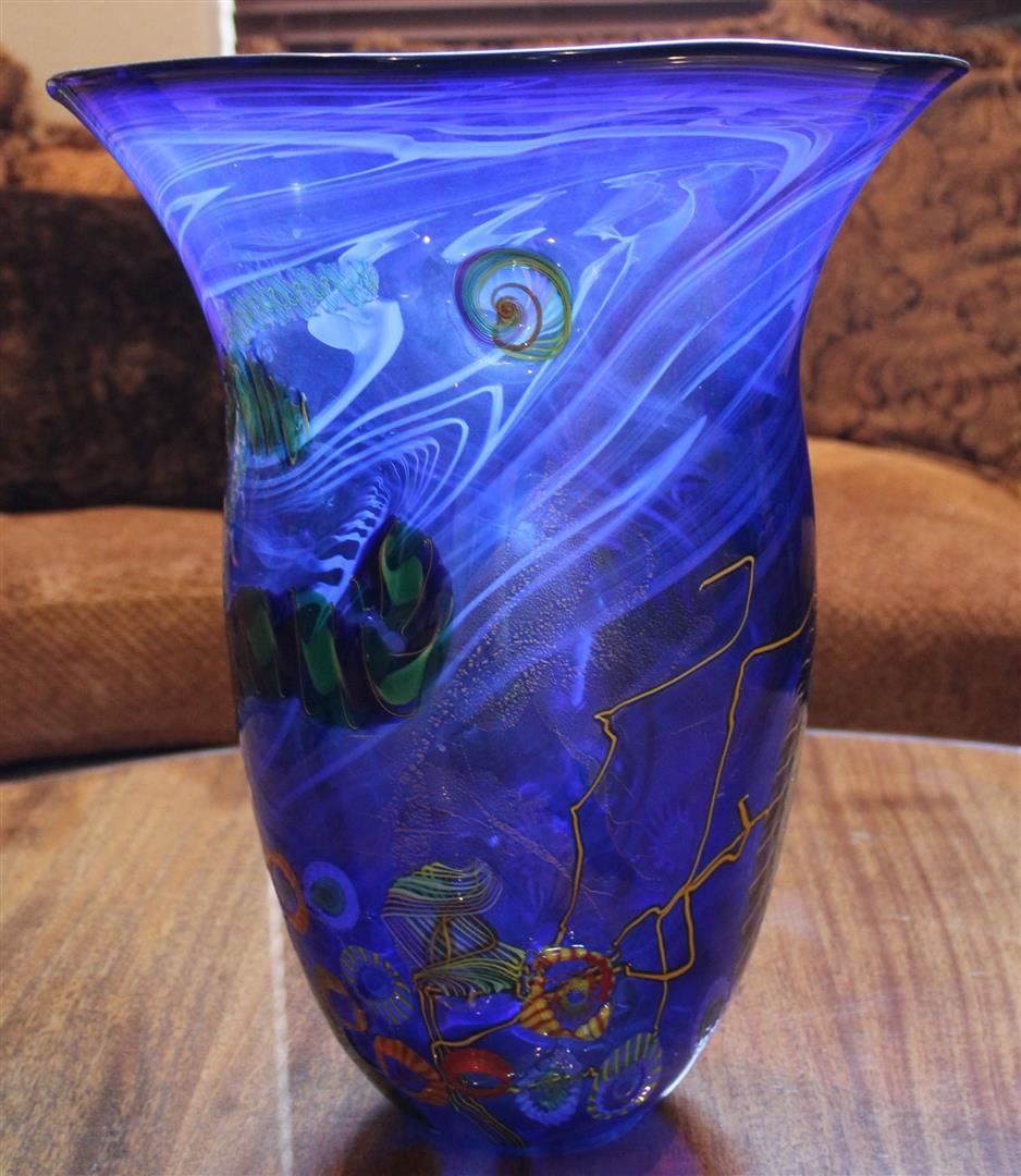 Glass sculptor Dutch Schulze created a brilliant blue glass vase with touches of colored abstract designs. The vase #303 measures18 x 14 x 14.