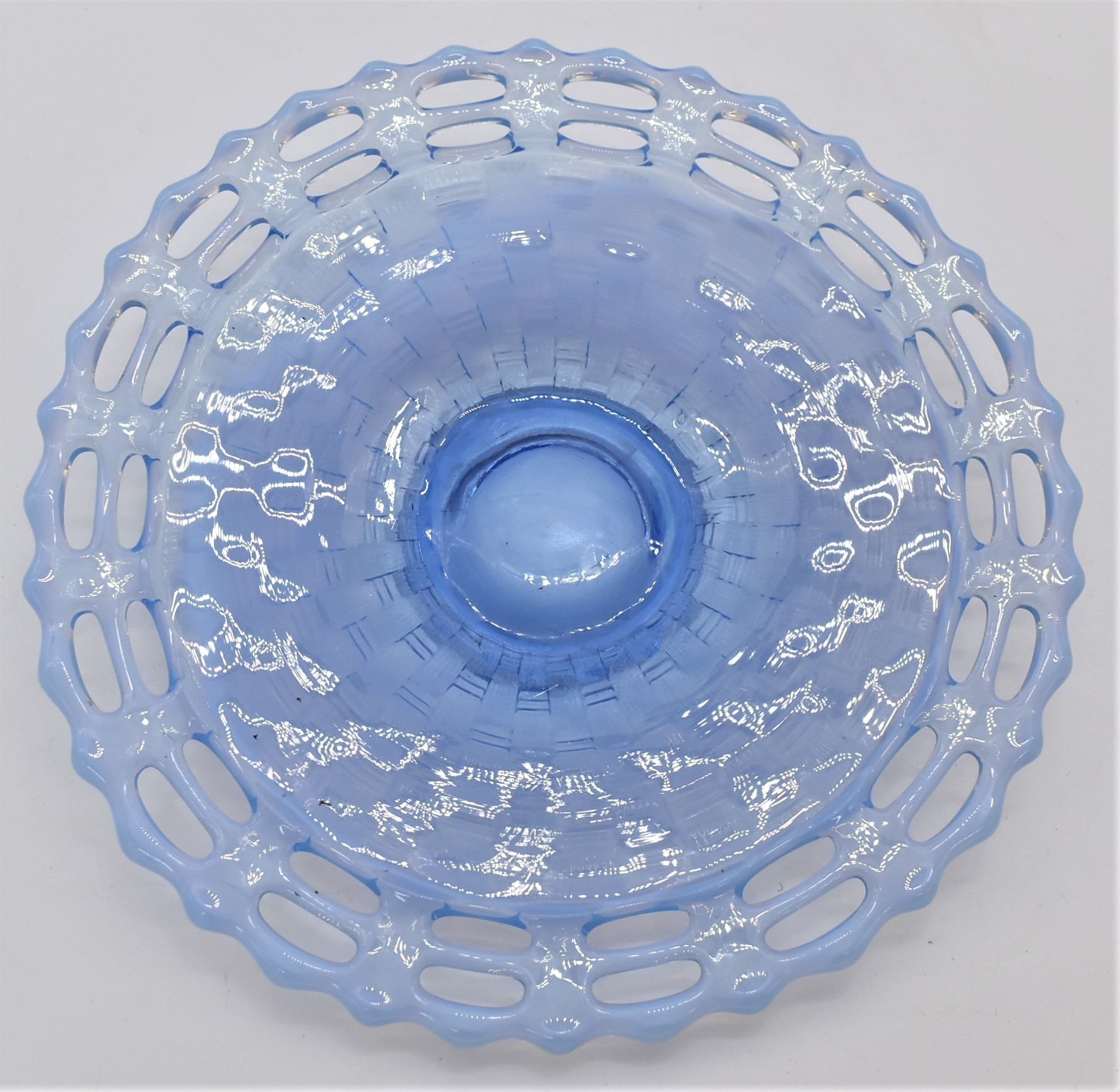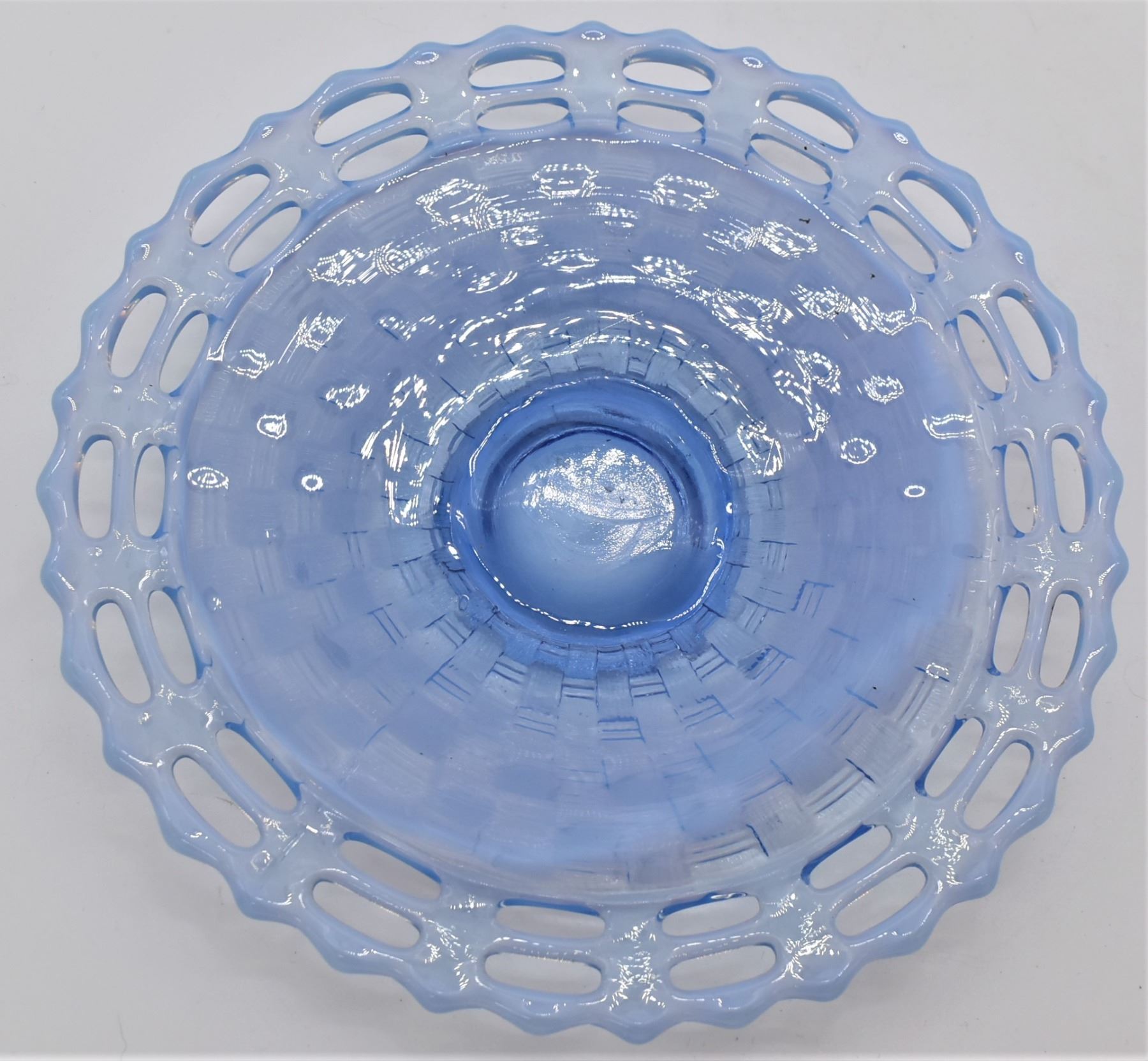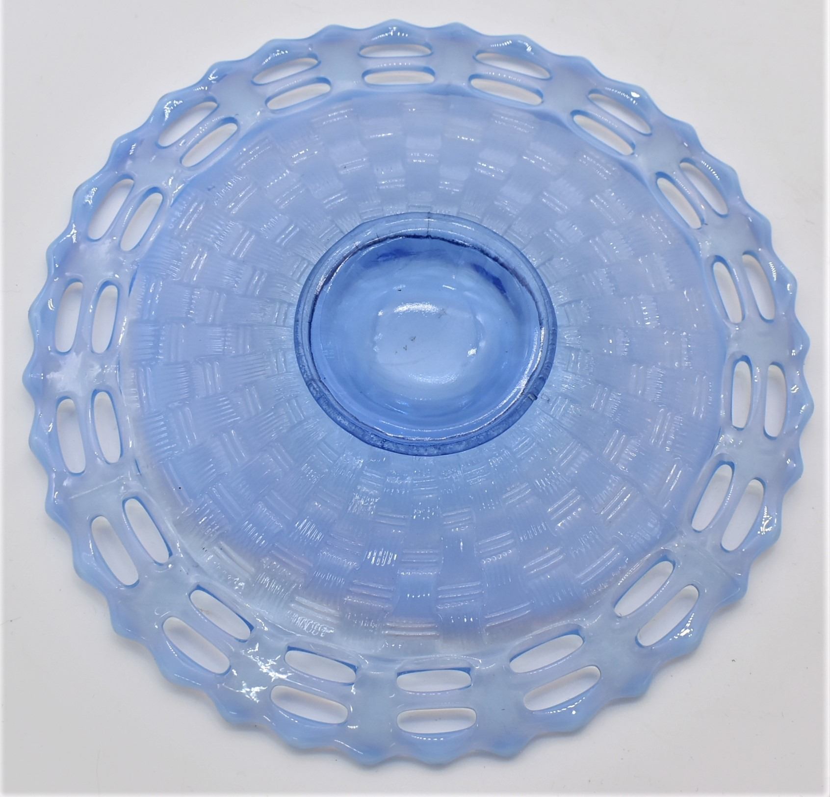 Vintage Blue Vaseline Uranium Basketweave Glass Shallow Bowl, measures 1''H x 8''D, does fluoresce