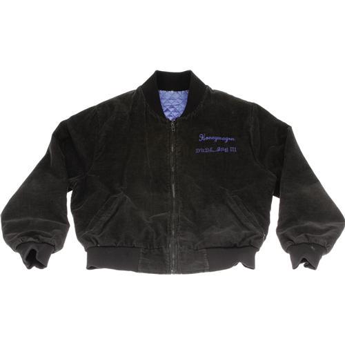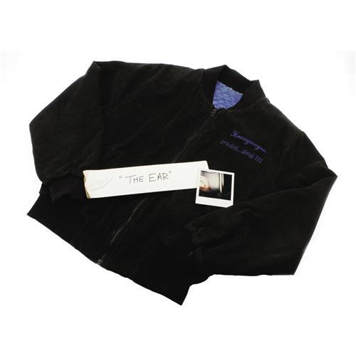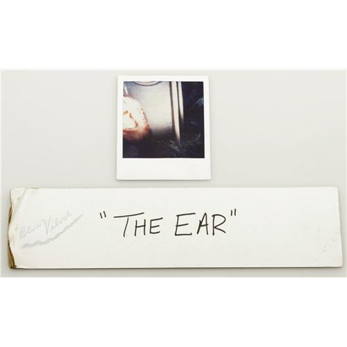 <B>"Blue Velvet" Crew Jacket.</B></I> David Lynch bounced back from his dismal experience making "Dune" by writing and directing this neo-noir masterpiece, a critical and commercial success that earned him his second Oscar nomination. This handsome black corduroy jacket, worn by a member of the production crew, is a men's size 42 and has a quilted blue lining and blue title logo and the tagline "It's a strange world..." embroidered on the back. It is in Excellent condition with some very minor wear to the collar. Also included are a trailer card bearing the Blue Velvet production stencil and "The Ear" handwritten on it in black marker, as well as a polaroid of said severed prop appendage, dressed with phony gore -- both in Excellent condition.