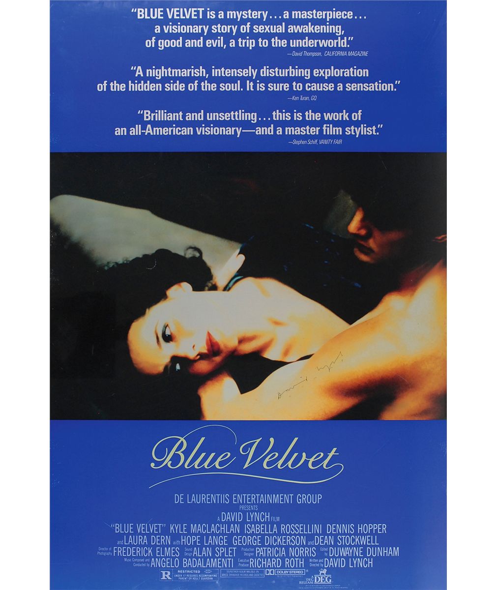 Color 26.5 x 39.5 one-sheet movie poster for the 1986 film Blue Velvet, signed in black ballpoint by director David Lynch. Some scattered creases and edge dings, and some light rubbing to some areas of edges, otherwise fine condition. Rolled. From the collection of noted publisher and founder of Lord John Press, Herb Yellin.