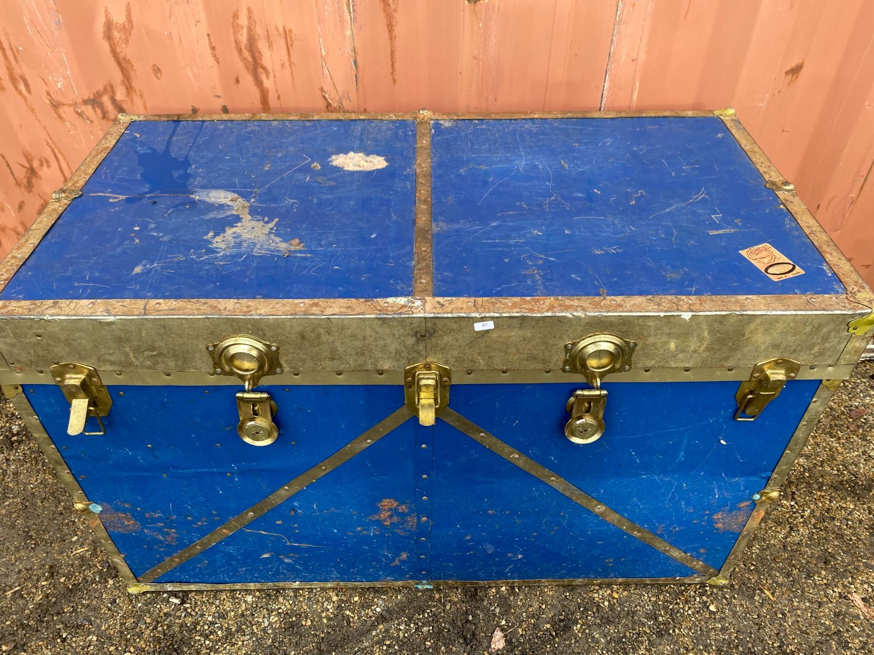 Large blue storage trunk with interior wear and peeling liner; great for decor or restoration.
