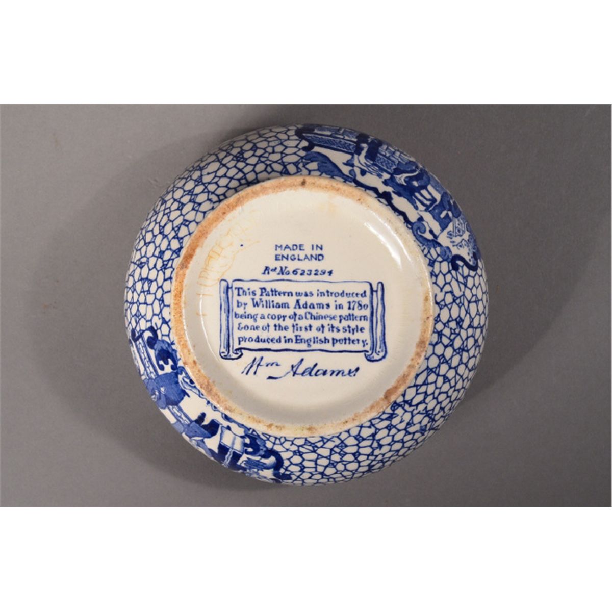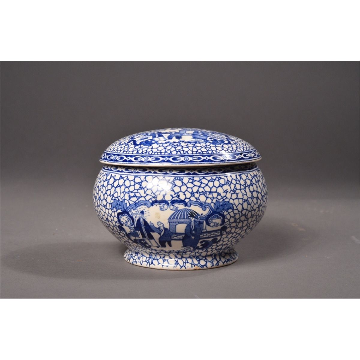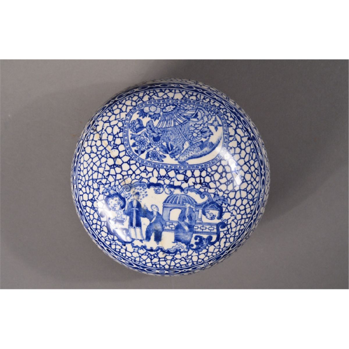Blue and white porcelain bowl (cracked lid); 3 1/4" tall, 4 1/4" diameter, with lid