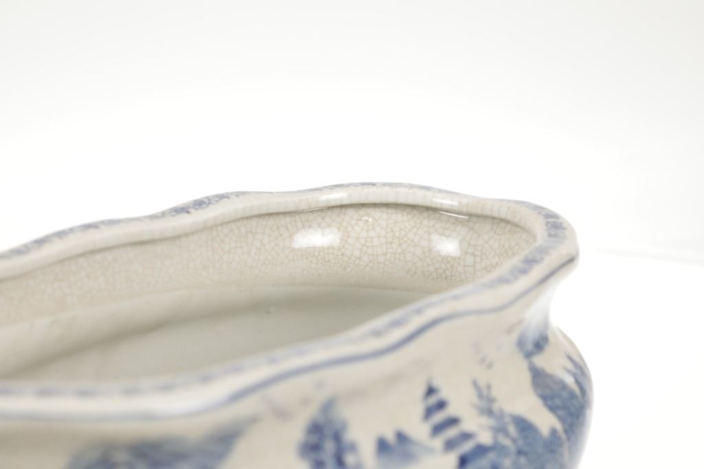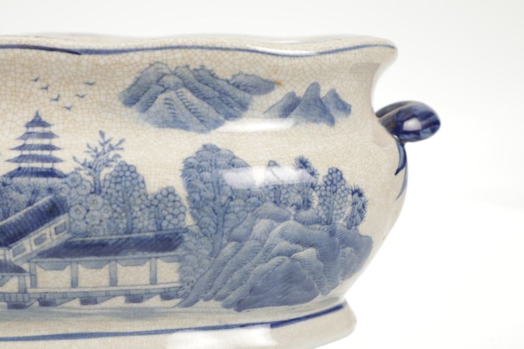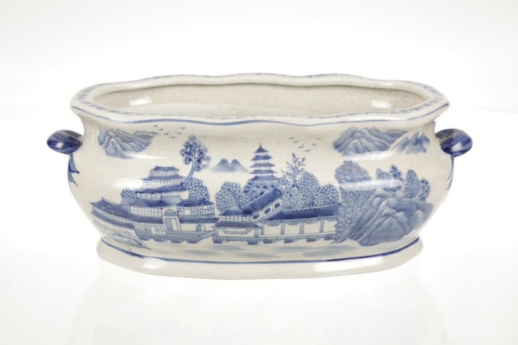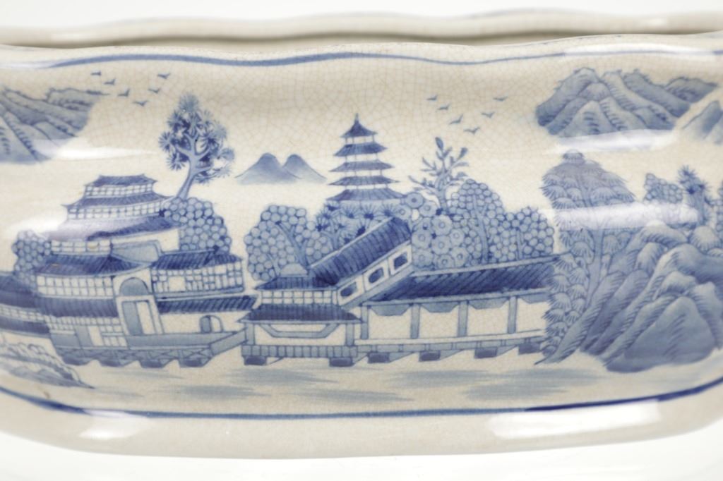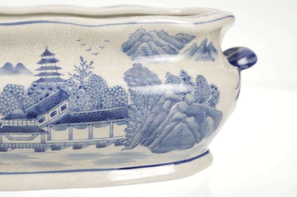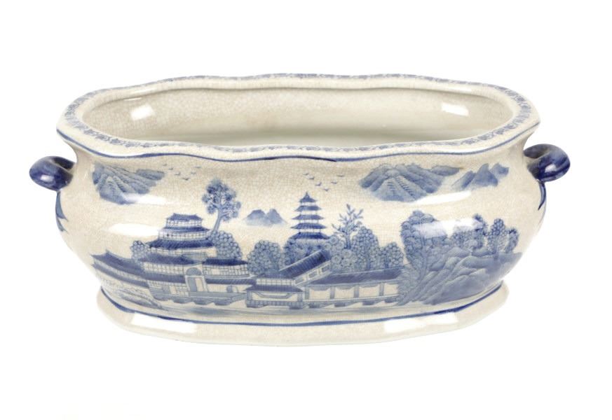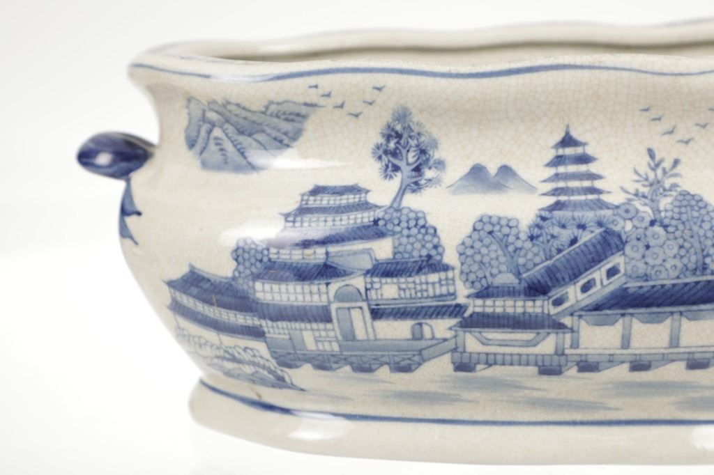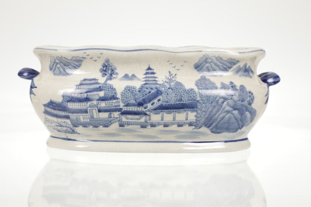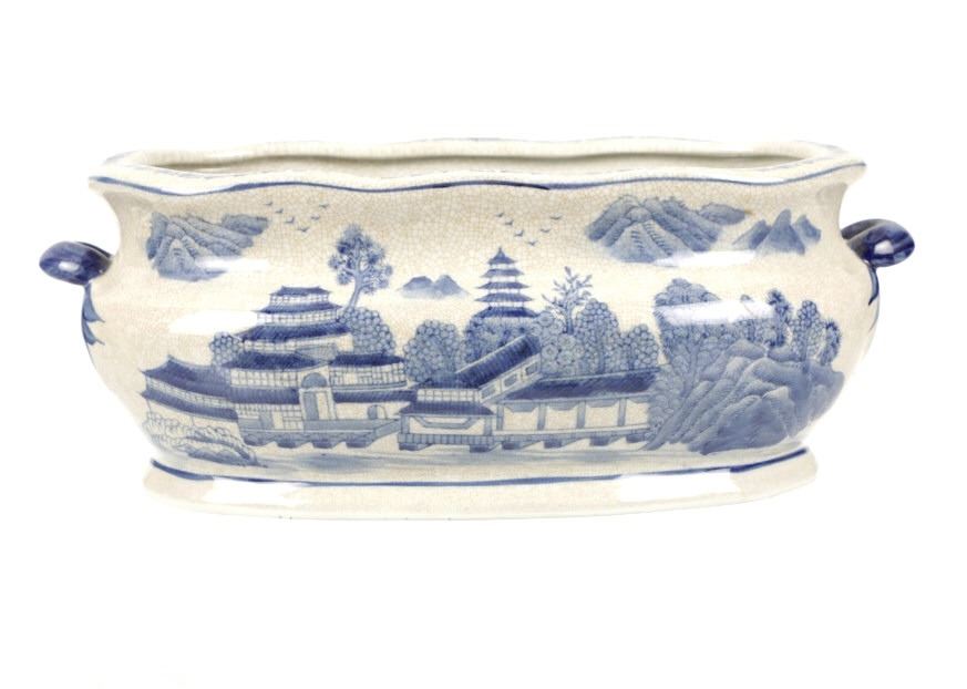 For your consideration is this Vintage Blue & White Chinoiserie Porcelain Foot Bath Basin with Double Handles. The scene depicted is that of a large house, possibly a palace surrounded by flora and trees of all types, with mountain ranges in the background while flocks of birds fly overhead. The rim has a continuous flower and vine design. Chinoiserie was once the most coveted fashion of the aristocracy. During the 17th and 18th centuries, Europeans became fascinated with Asian cultures and traditions. They loved to imitate or evoke Asian motifs in Western art, architecture, landscaping, furniture, and fashion. Truly a piece of art that evokes a much simpler and peaceful way of life. The Chinoiserie foot bath is in good overall condition, crazing is visible throughout the enamel finish, no other obvious marring noted. Measures 8"W x 16"L x 6"H approximately.