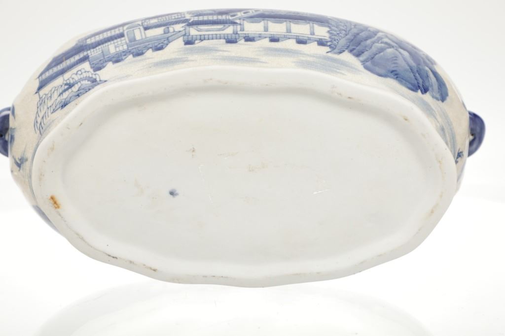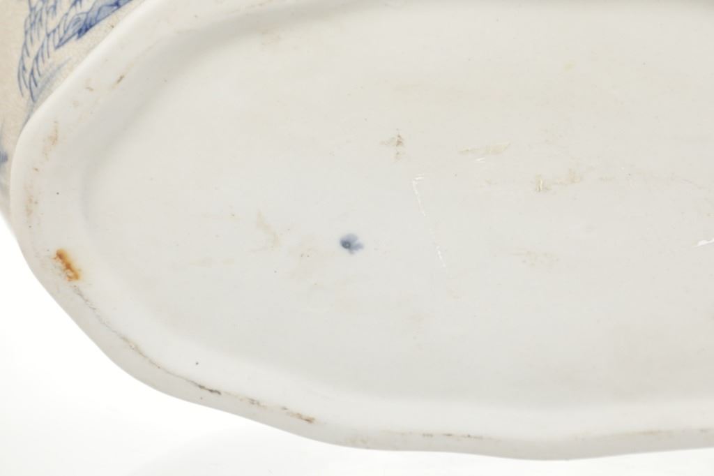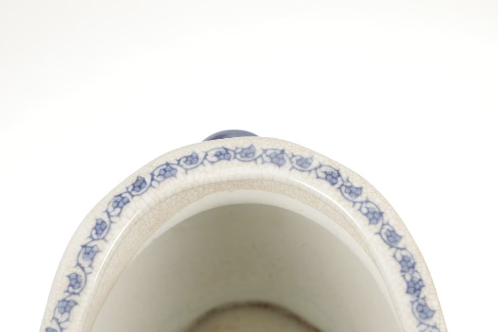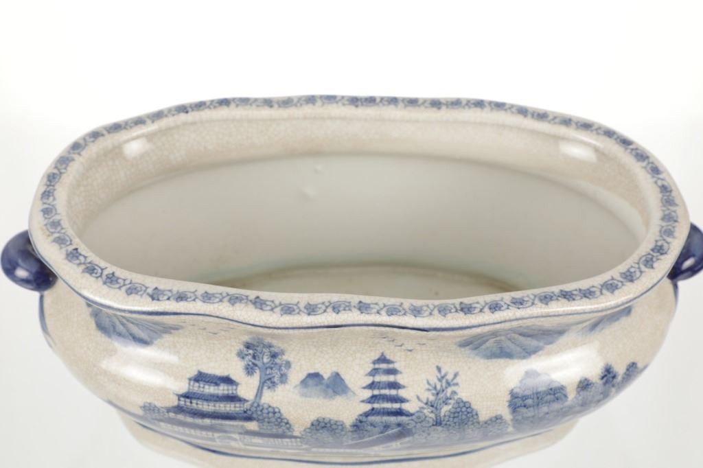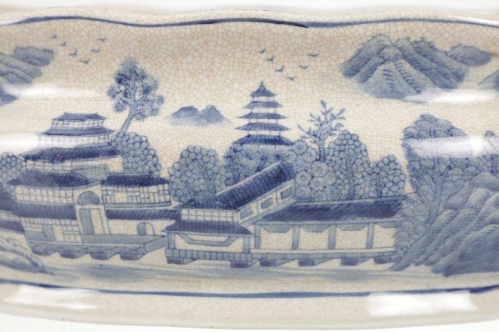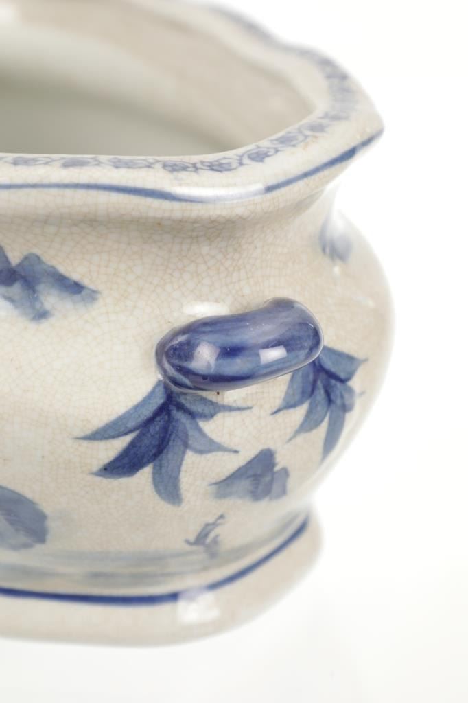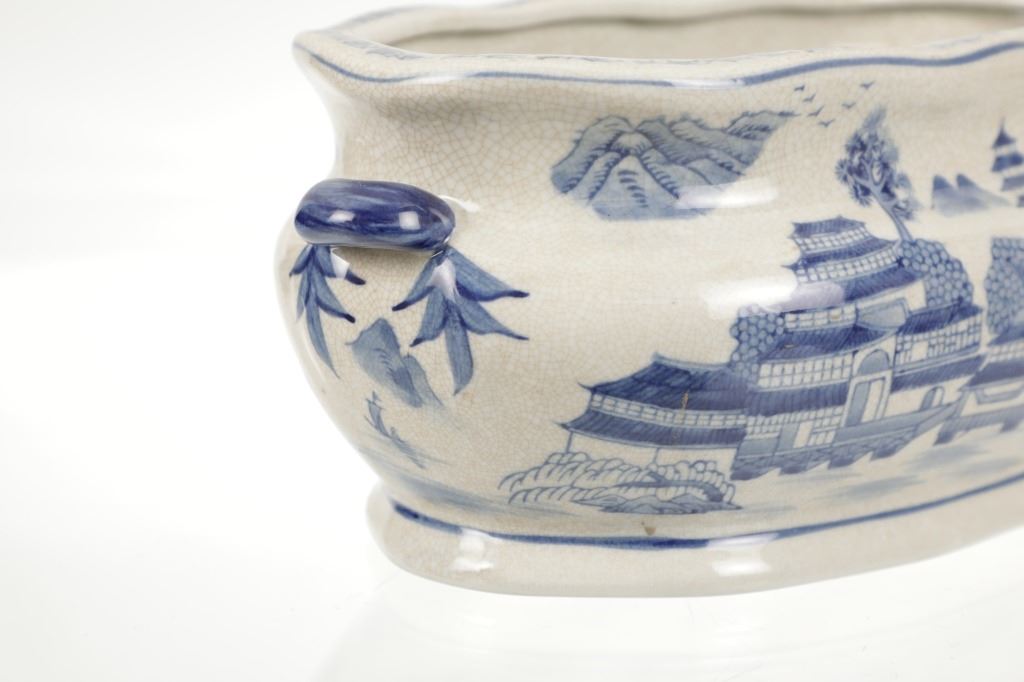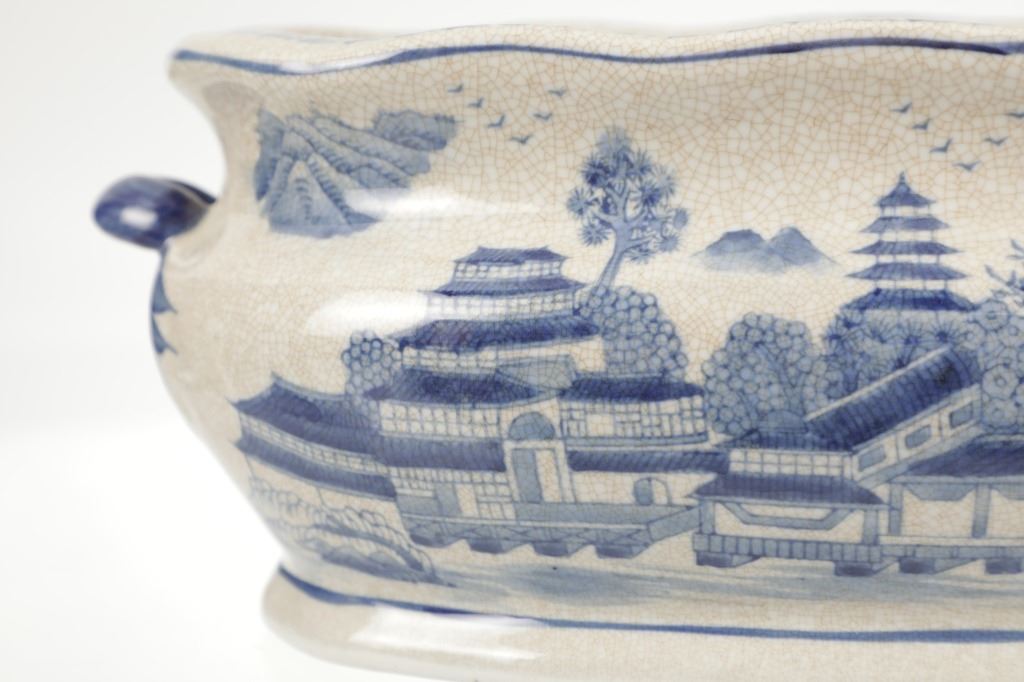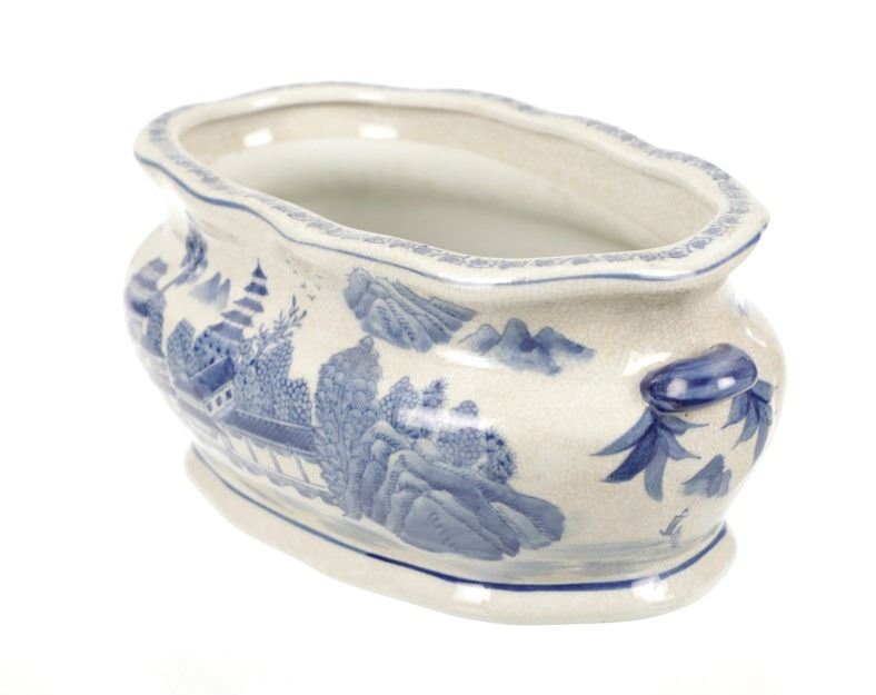 For your consideration is this Vintage Blue & White Chinoiserie Porcelain Foot Bath Basin with Double Handles. The scene depicted is that of a large house, possibly a palace surrounded by flora and trees of all types, with mountain ranges in the background while flocks of birds fly overhead. The rim has a continuous flower and vine design. Chinoiserie was once the most coveted fashion of the aristocracy. During the 17th and 18th centuries, Europeans became fascinated with Asian cultures and traditions. They loved to imitate or evoke Asian motifs in Western art, architecture, landscaping, furniture, and fashion. Truly a piece of art that evokes a much simpler and peaceful way of life. The Chinoiserie foot bath is in good overall condition, crazing is visible throughout the enamel finish, no other obvious marring noted. Measures 8"W x 16"L x 6"H approximately.