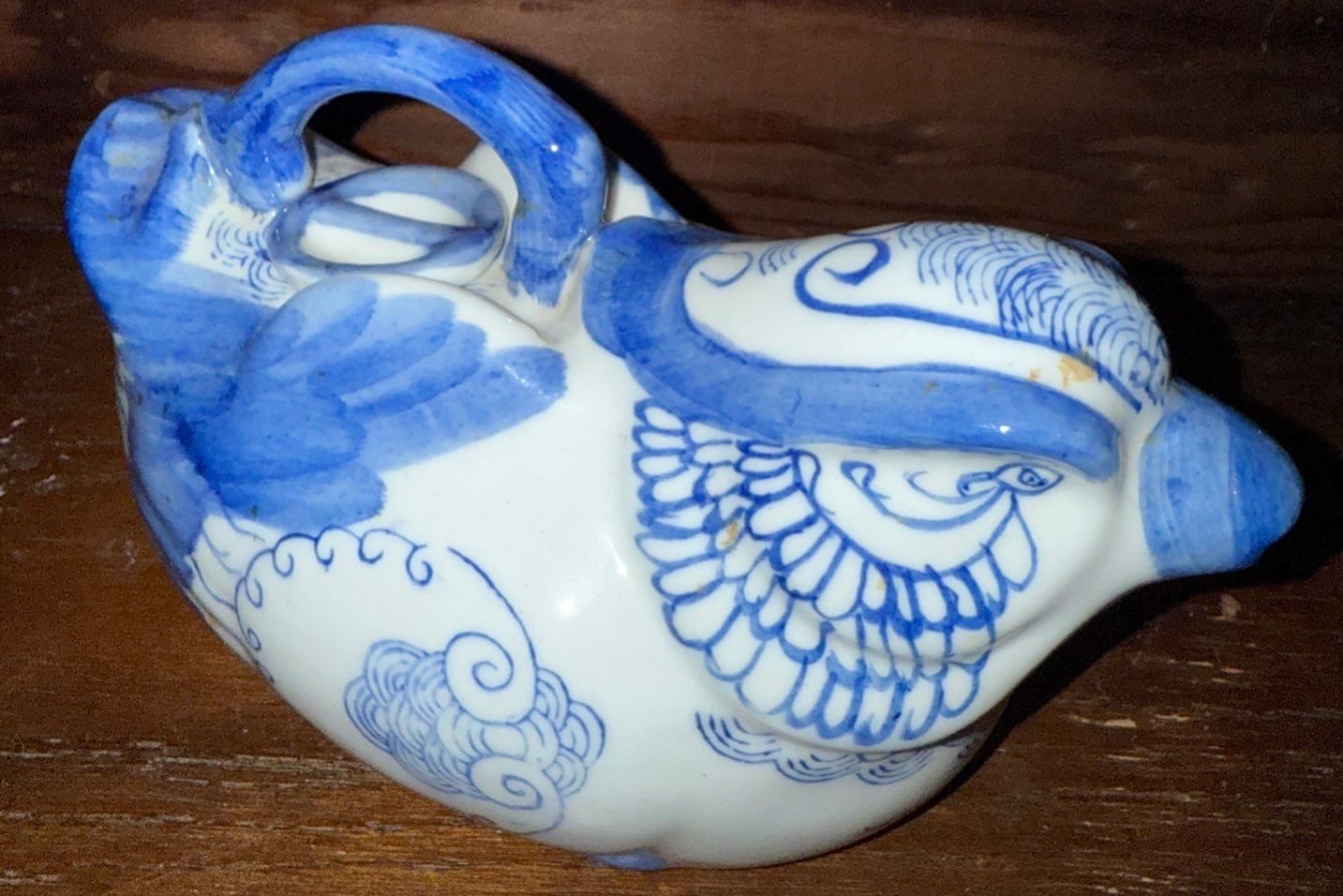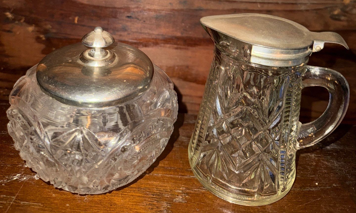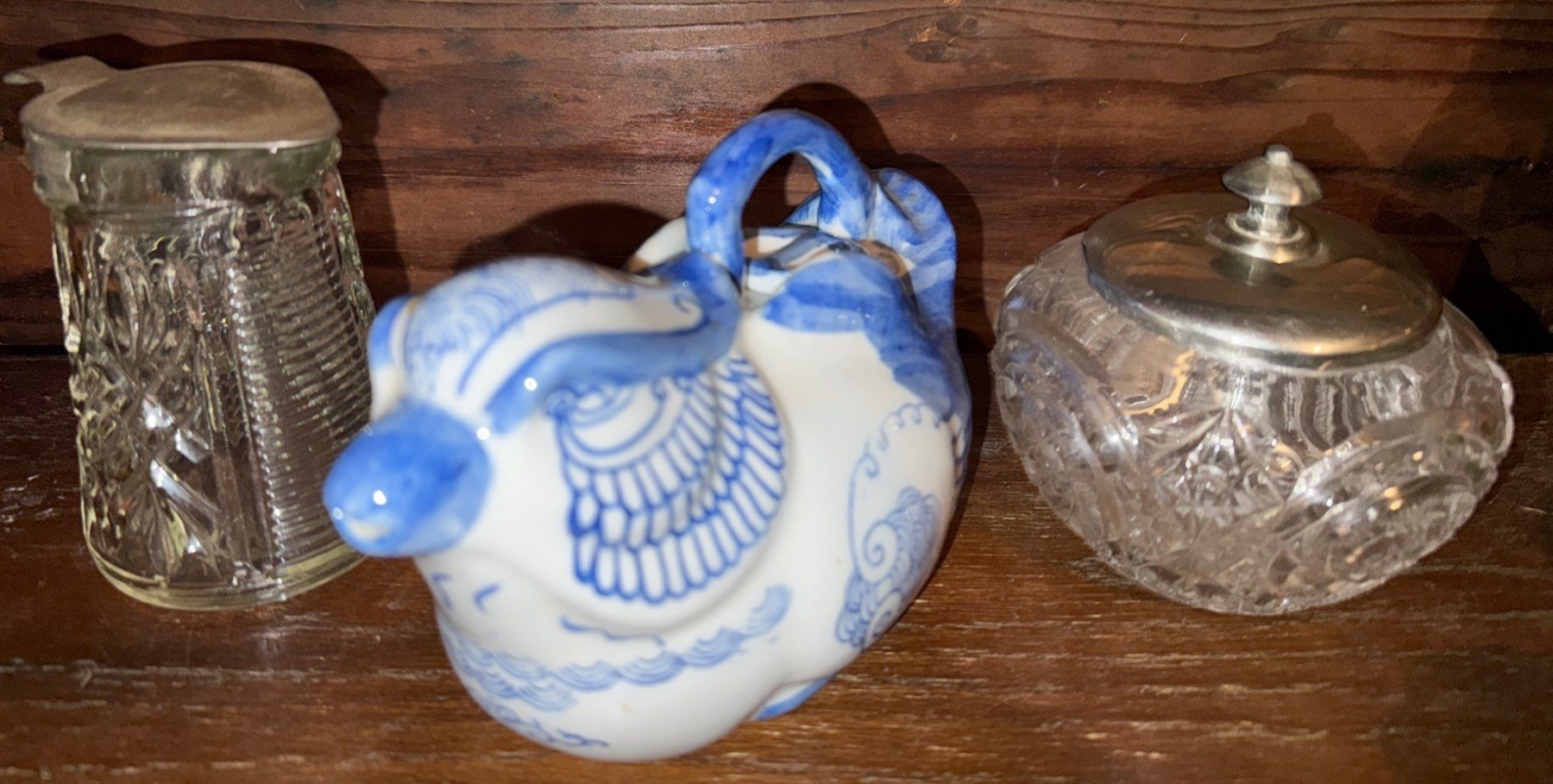 Blue & White Dove Bird Teapot & Vintage Cut Glass Pattern Cream & Sugar Set