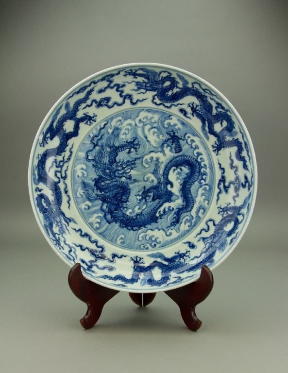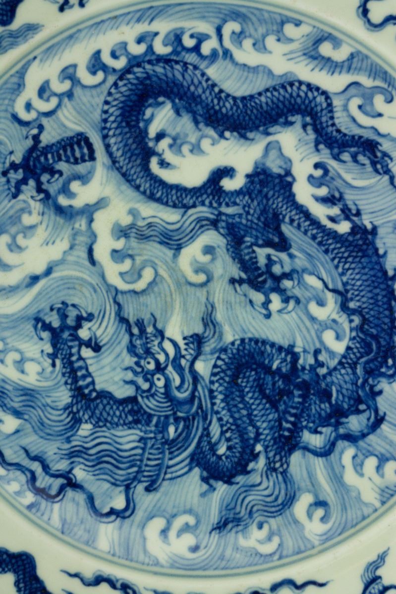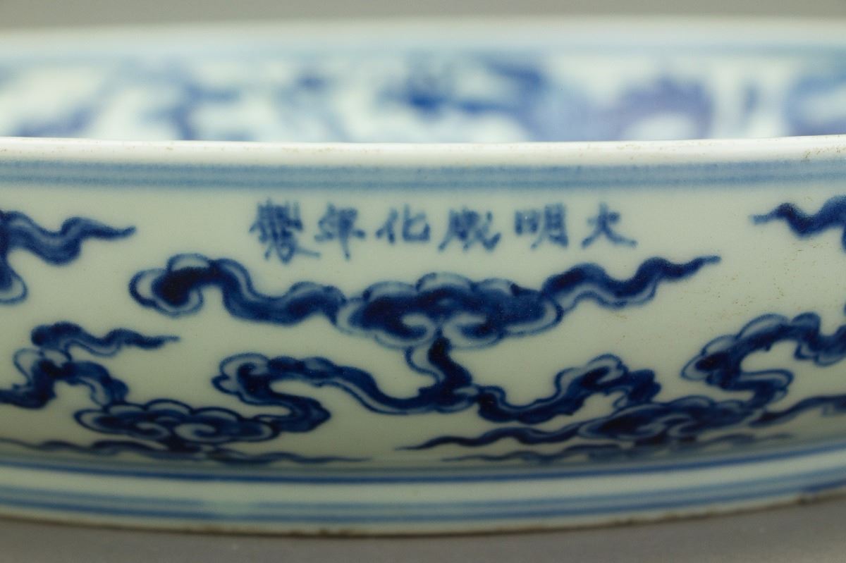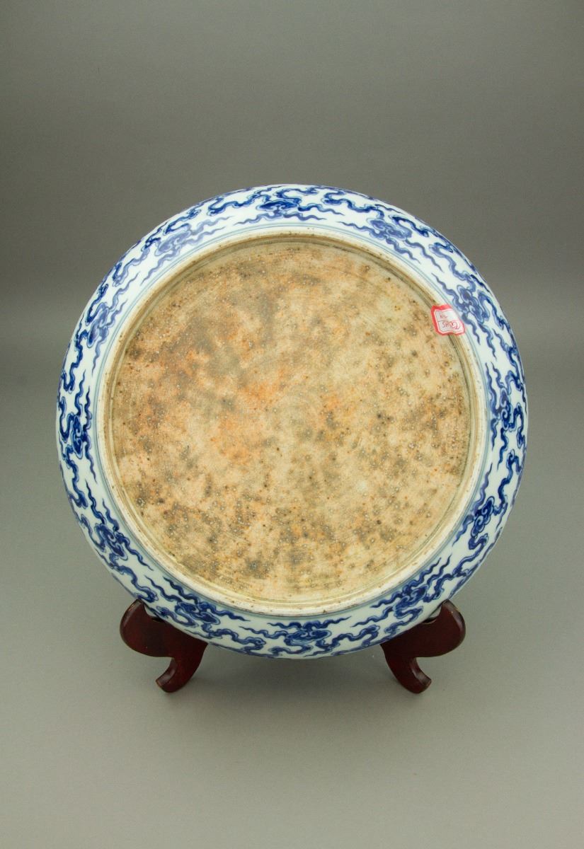 Chinese blue and white porcelain plate; of shallow rounded sides rising from a circular short foot; the interior painted with a medallion of five-clawed coiling dragon amidst turbulent waves enclosed by a band of striding dragons amidst clouds; six-character Chenghua mark on rim; unglazed base; H: 5.8 cm, Mouth: 31 cm, Foot: 23 cm
