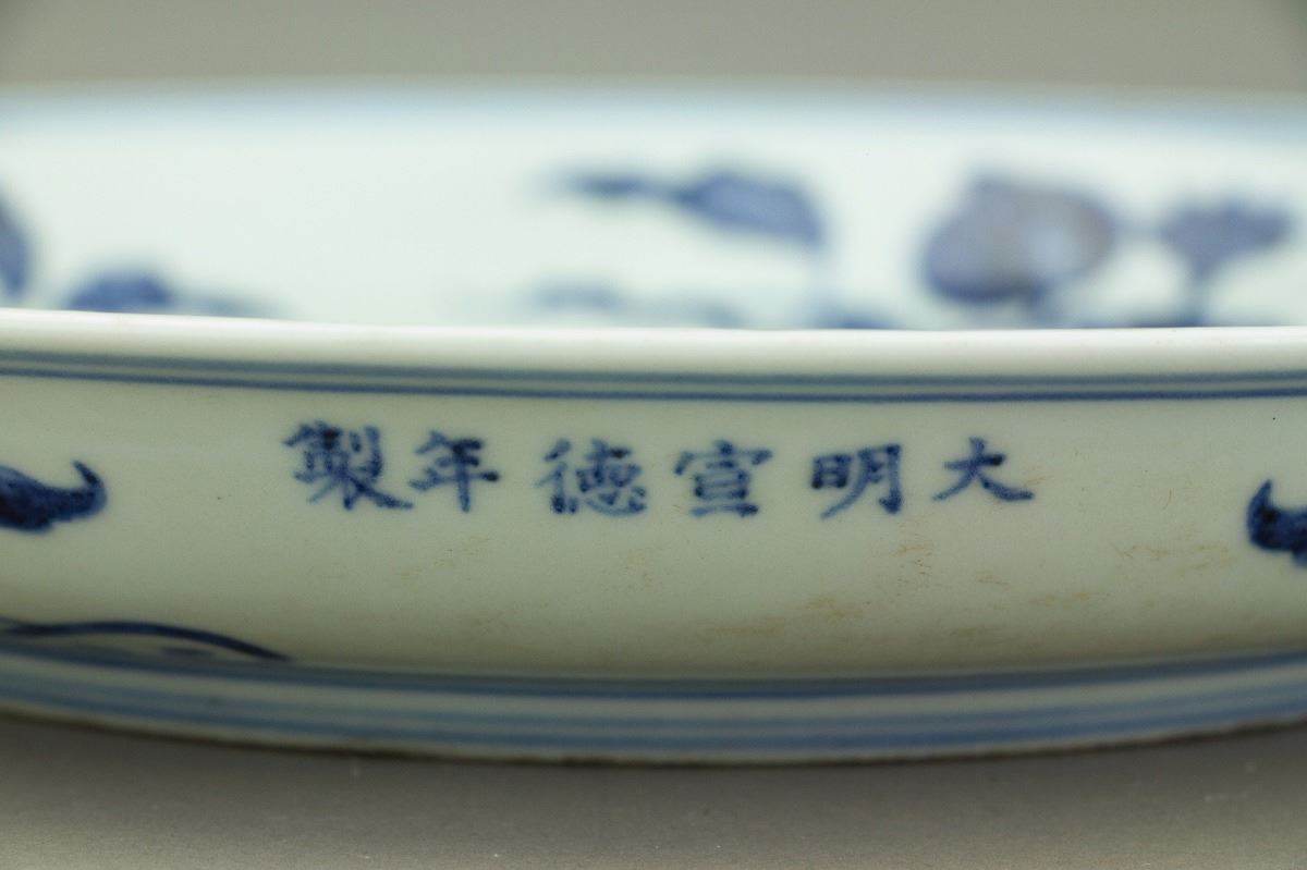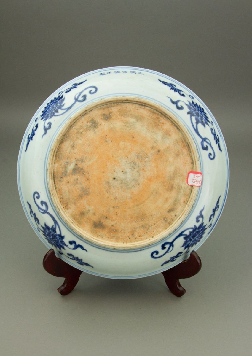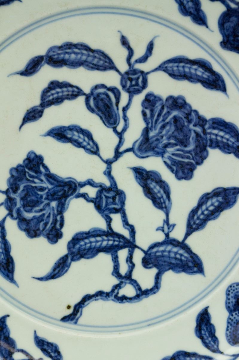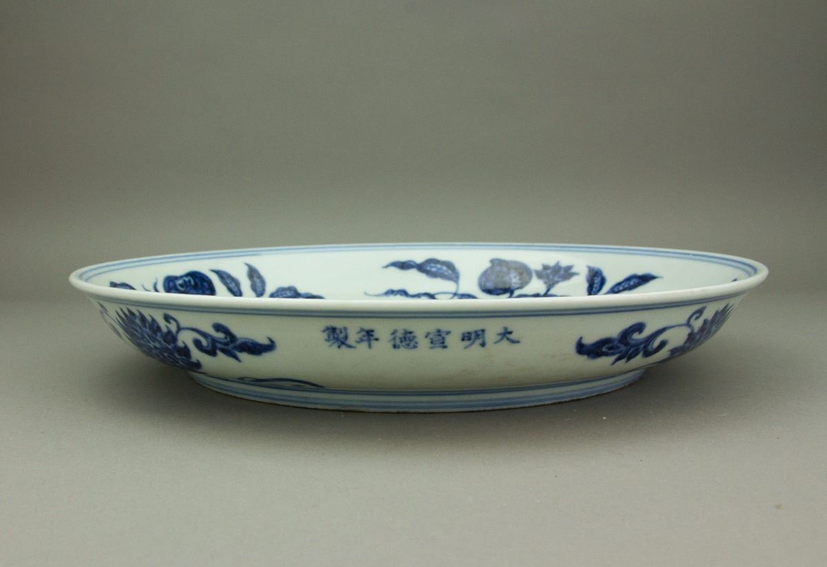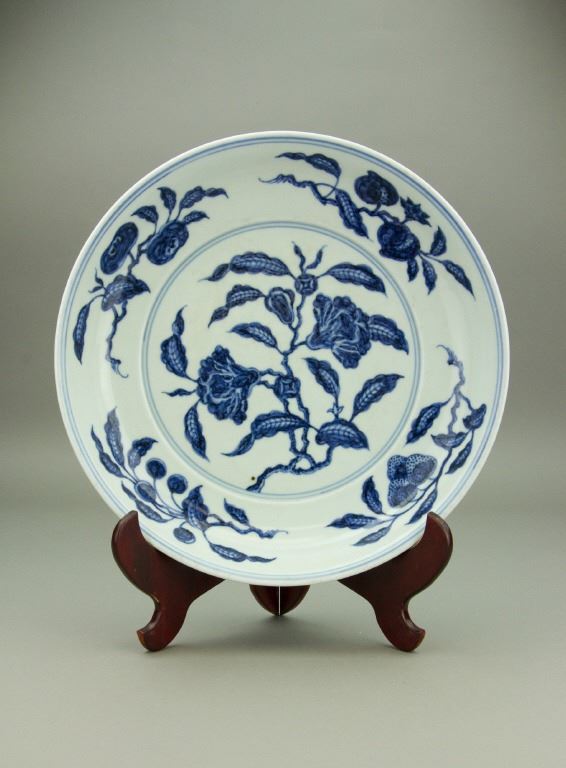 Chinese blue and white porcelain plate; of curved sides; painted on the interior with a large flower spray; encircled on the cavetto with detached branches of peach, persimmon, cherry and lychee; six-character Xuande mark on the exterior of the rim; unglazed base; H: 4.5 cm, Mouth: 30 cm, Foot: 20.5 cm