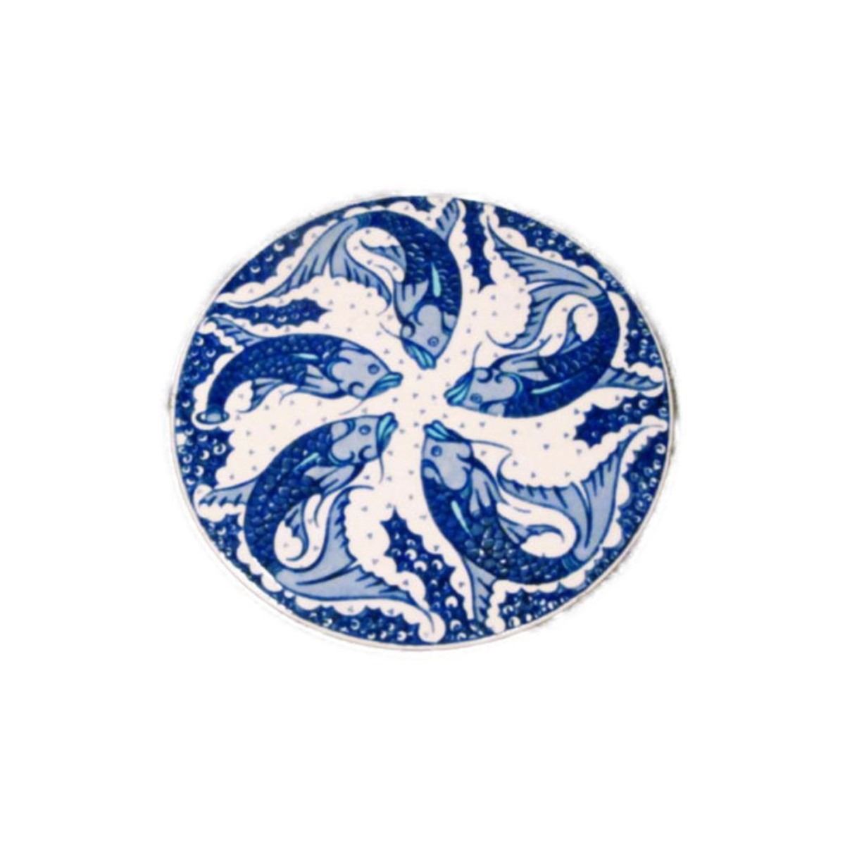 Beautiful blue and white glazed pottery trivet featuring carp/fish/koi. It measures 6 1/4" wide and is in excellent condition with a few tiny chips/flakes along the edge. - 9163-020118-EB-91158