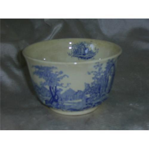 A blue and white English transfer decorated handless cup. This item is signed "English Abby " and is in very good condition with some bottom staining only.
