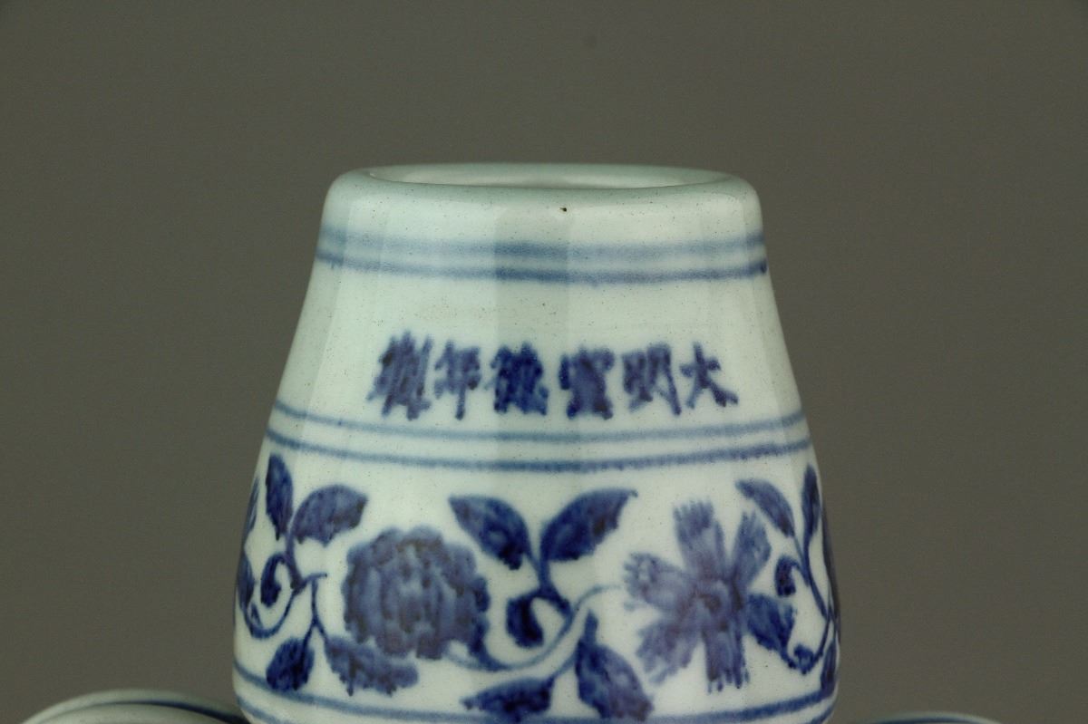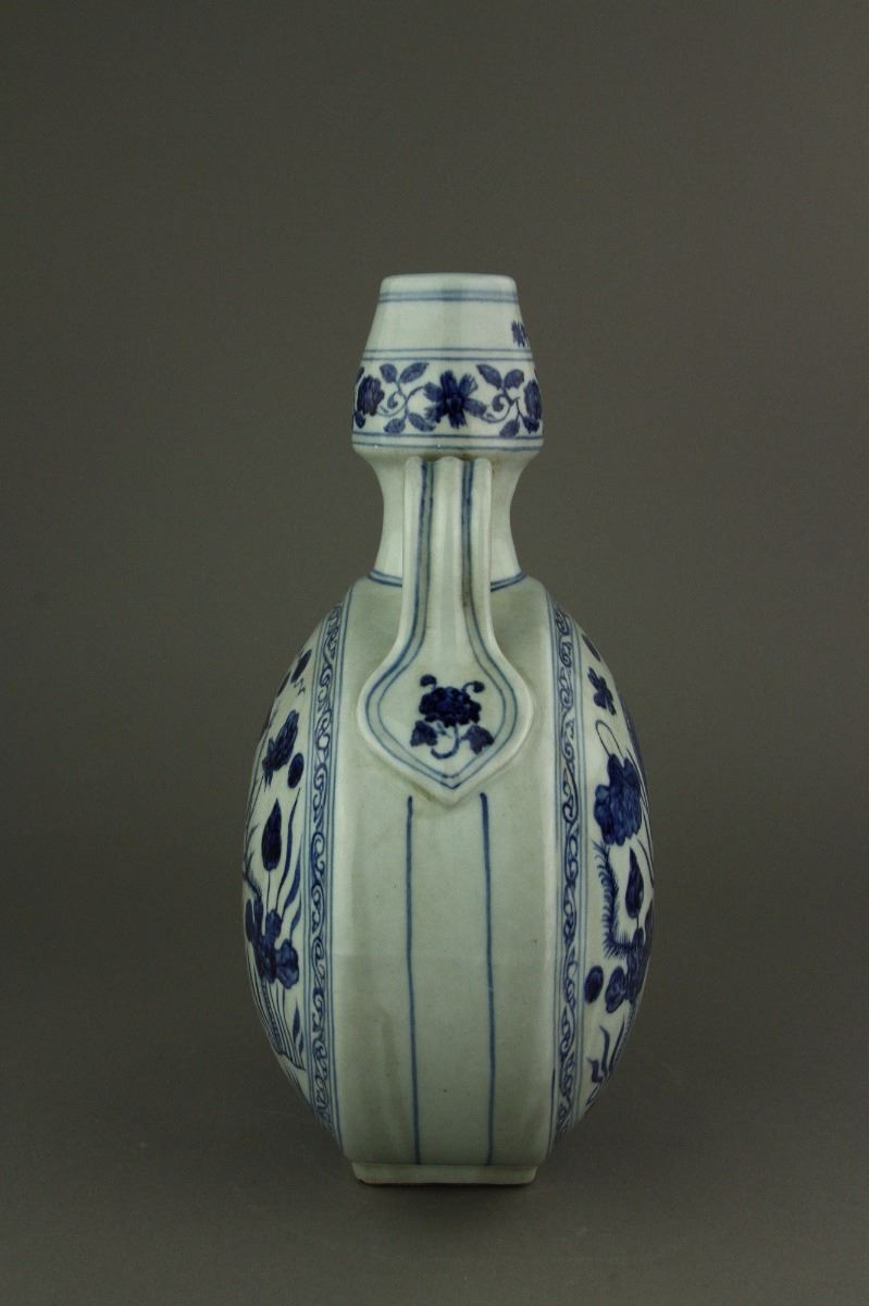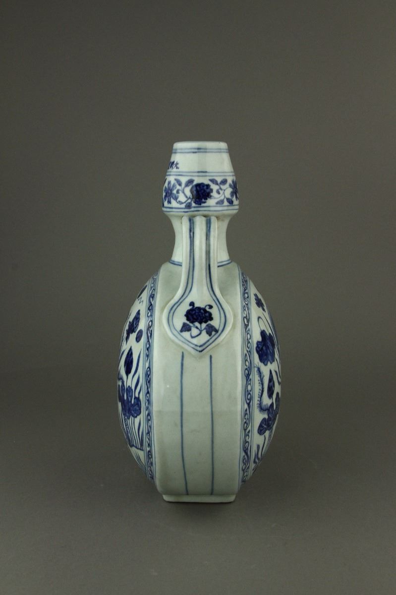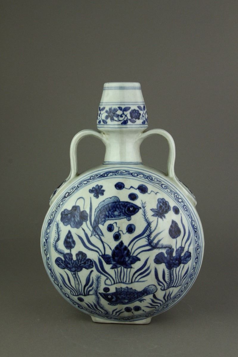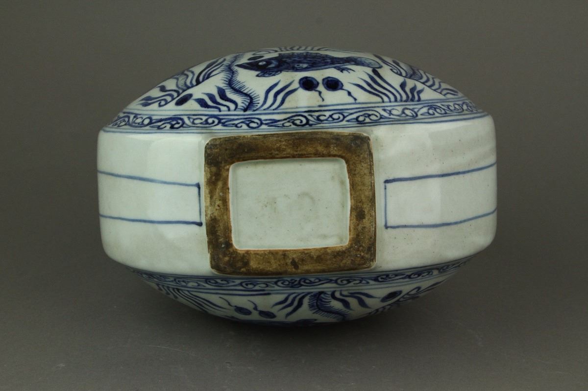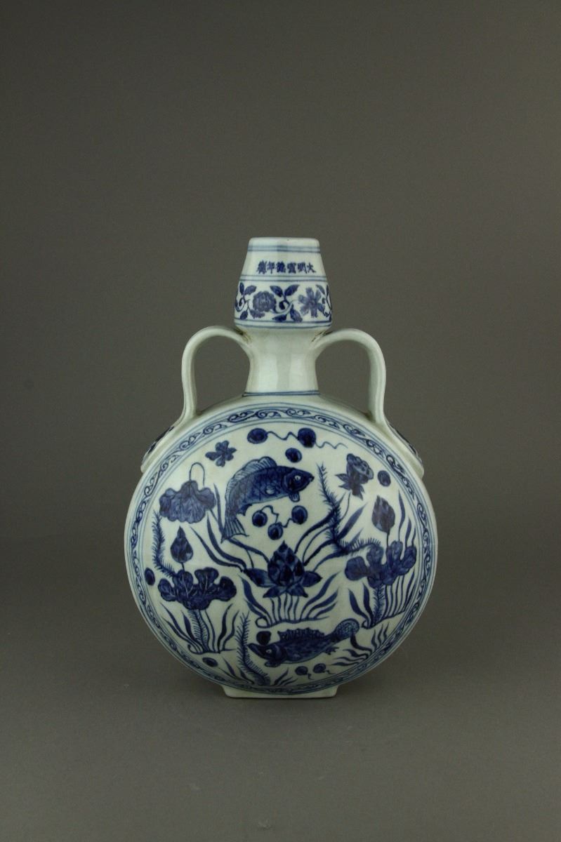 Chinese blue and white moon flask porcelain vase; the convex body flanked by double curved handles; decorated with carps swimming among aquatic plants and lotus; six-character Xuande mark on rim; H: 20 cm, D: 31 cm, 1847 grams