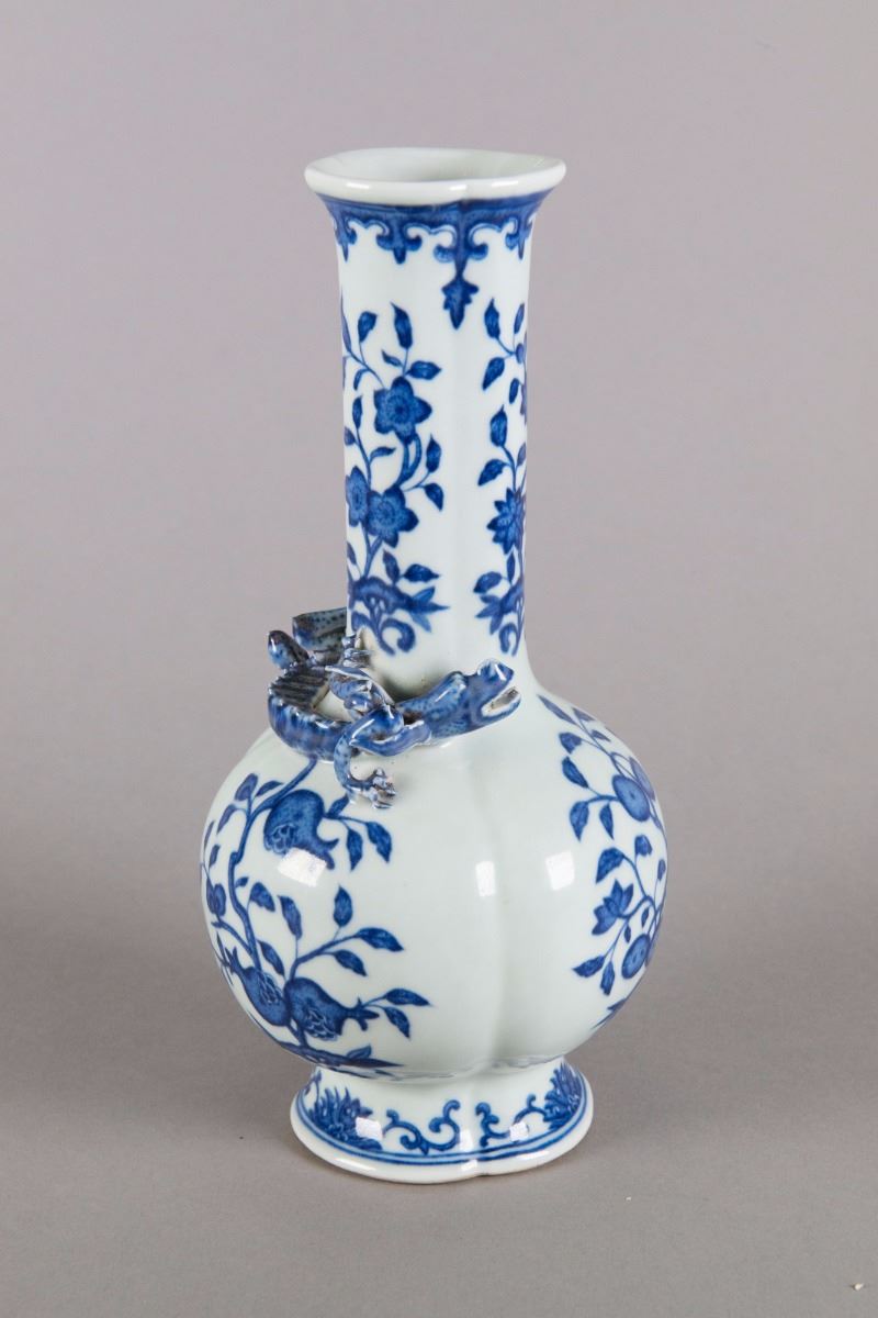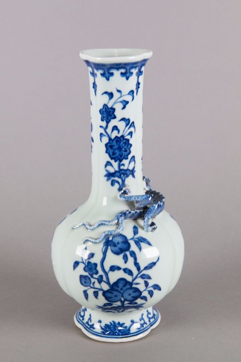 Chinese blue and white porcelain vase; lobed body featuring plum tree blossoms and plums borne on branches; the shoulders featuring a clambering dragon in molded relief; six-character Qianlong Mark on base; H: 23 cm, D: 18.5 cm, 648 grams
