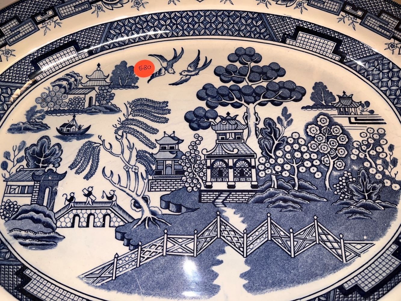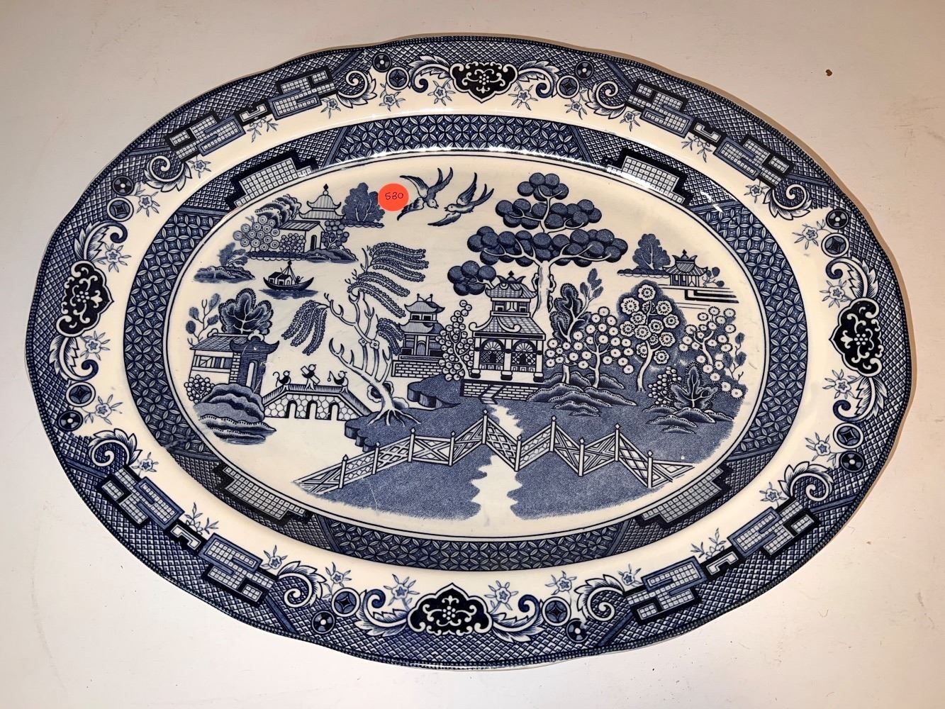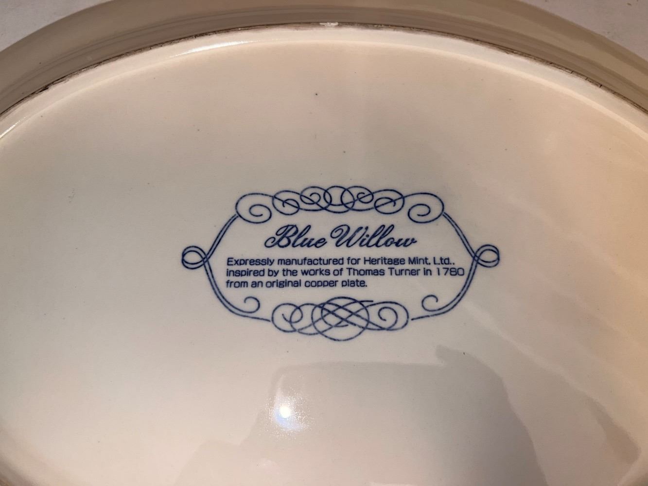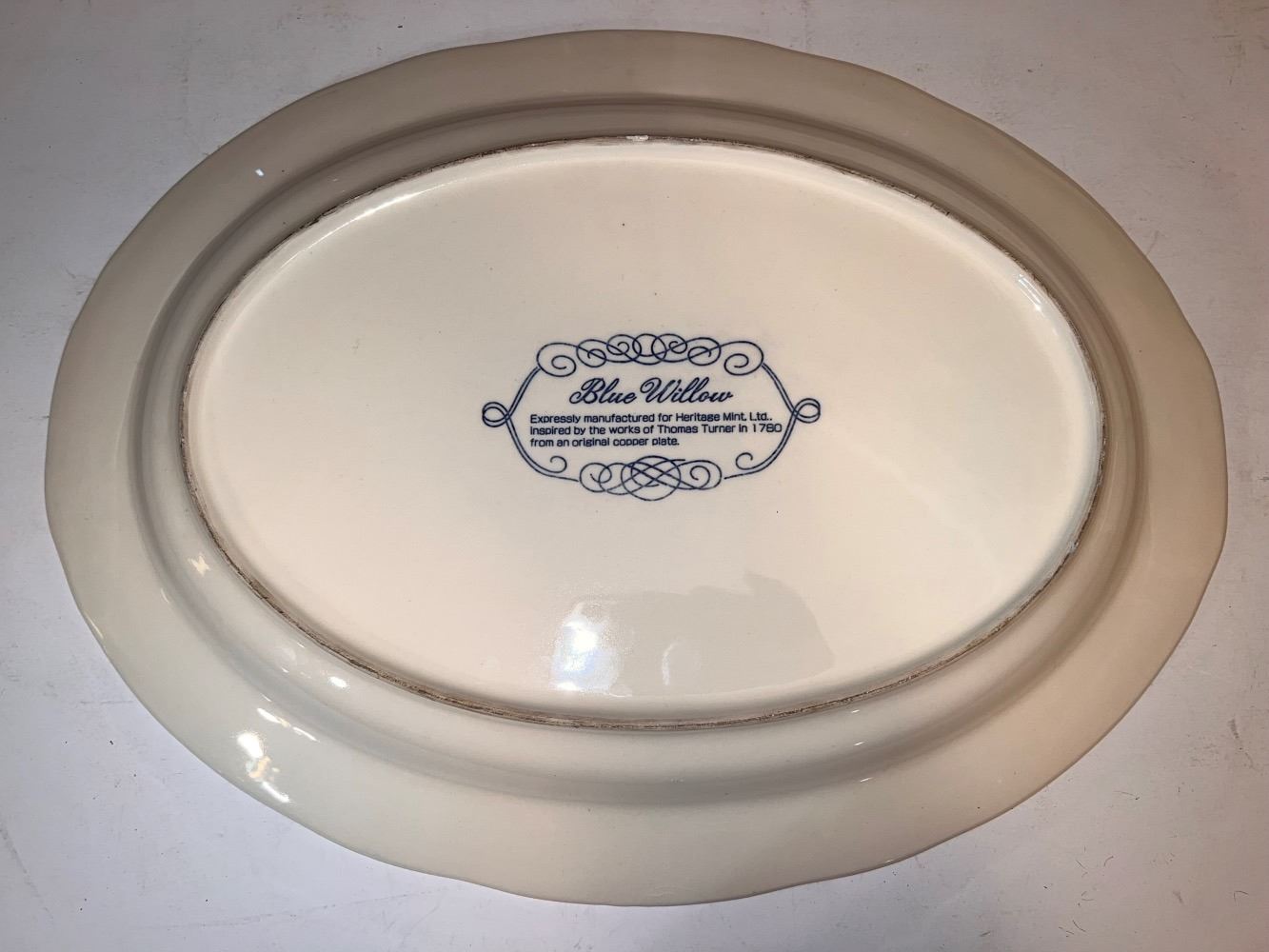 Blue Willow, Blue and White Platter. "Expressly manufactured for Heritage Mint, Ltd. Inspired by the works of Thomas Turner in 1780 from an original copper plate". Measures approx. 18.5 inches wide.