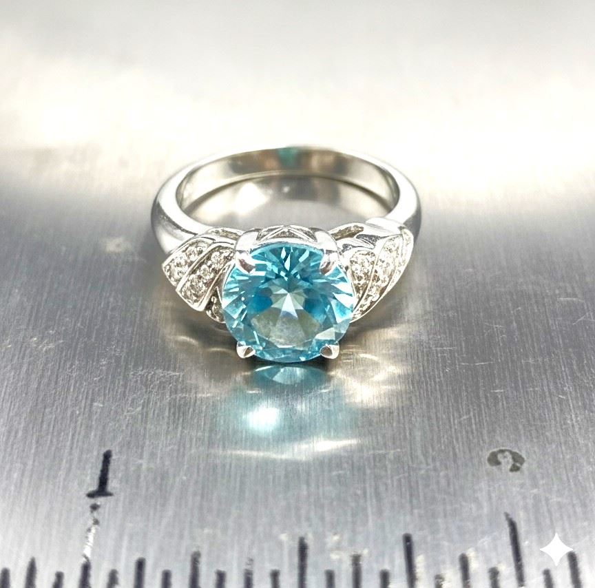 A vibrant treasure in 18K white gold, size 6.75, weighing 5.87 grams. The centerpiece is a 4.78 ct round, faceted natural blue zircon, radiating exceptional brilliance and fire. Accenting the gem are .12 ctw of round brilliant-cut diamonds (G color, SI1 clarity), set along the swirled shoulders for a graceful touch of sparkle. Claw prongs secure the zircon, while the firm under gallery ensures both comfort and durability. A rare gemstone paired with refined craftsmanship, perfect for collectors of distinctive elegance. See sizing details and other information below. AdminCode: 6282/1 -bgrr