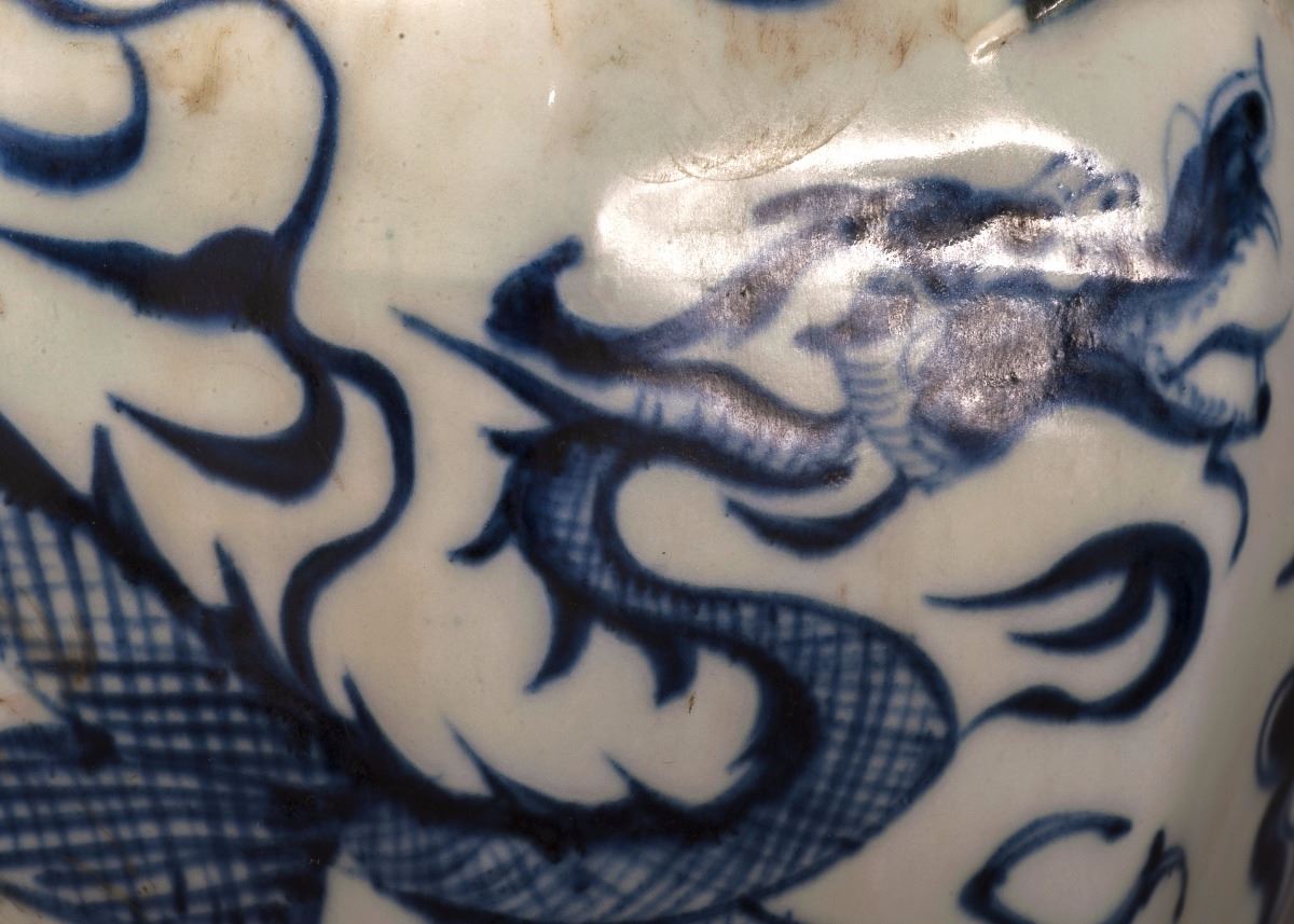Glazed In Fine Blue And White Throughout, Painted With A Vivid Dragon At The Finely Potted Cavetto, Designed In Extremely Detailed And With Its Face Vividly Expressed. Two Delicate Designed Handles In The Form Of Chi Long Statue. Heavily Potted Rim At Mouth.