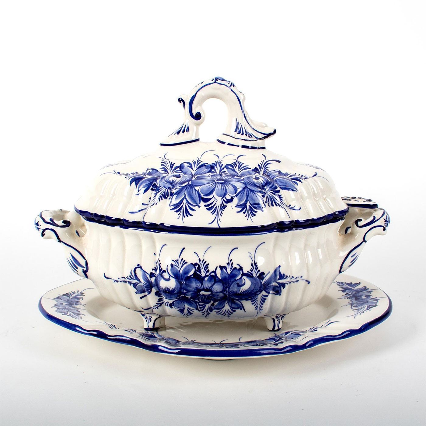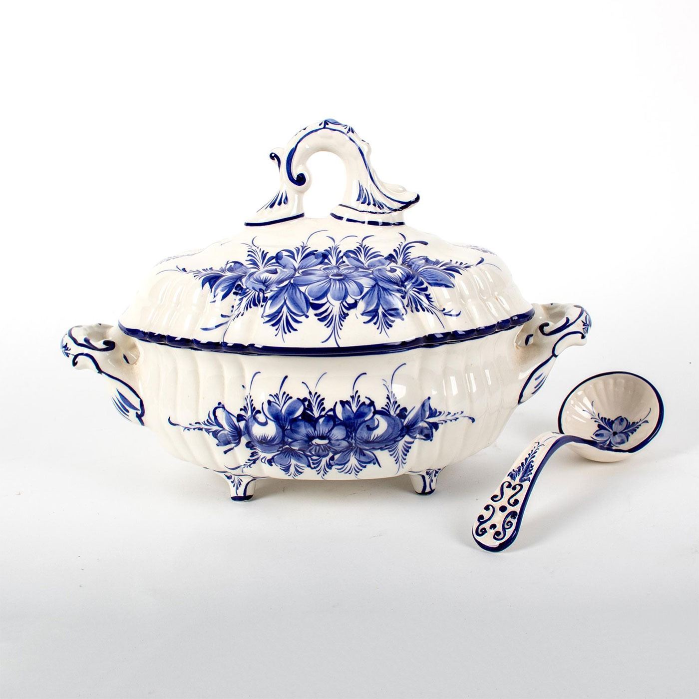 Blue and White Ceramic Soup Tureen, Ladle and Platter Plate