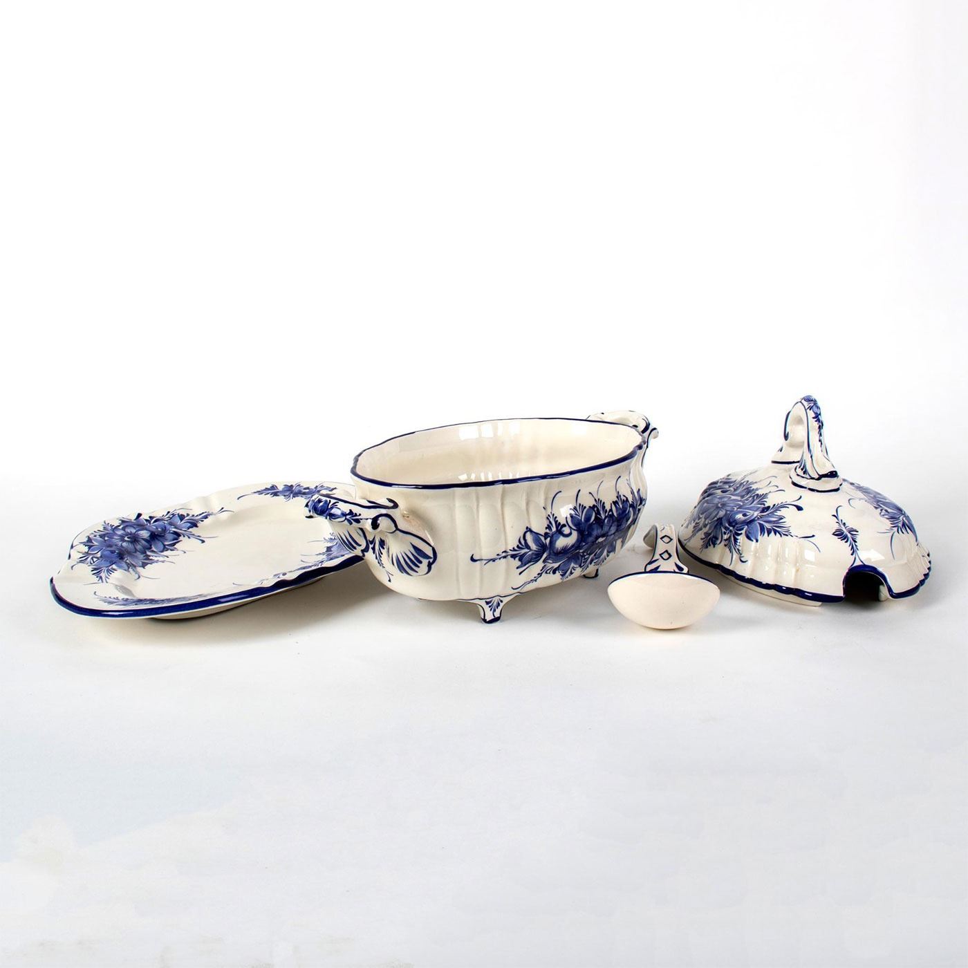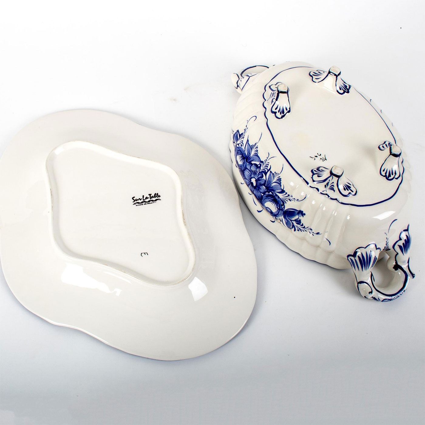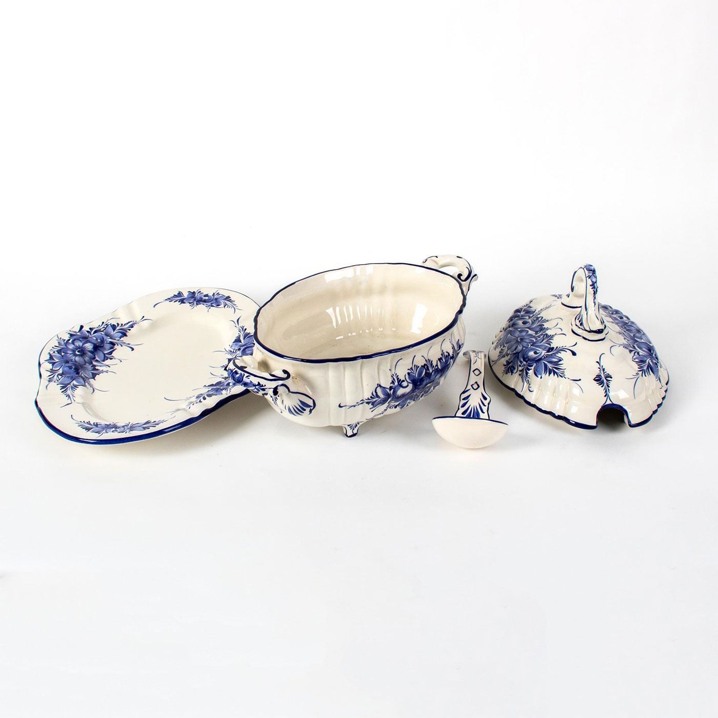 Beautiful blue and white hand-painted flowers. Ribbed pattern on the lid and ladle. Relief design on the handles of ladle and soup tureen. Sur La Table backstamp on the platter plate. Good condition. Measurements - Lid 13"L x 8"H. Soup Tureen - 17"L x 5.5"H. Platter Plate - 17.5"L x 2"H. Ladle - 10.75"L. #portugal #ceramic #dinnerware #soup #holiday