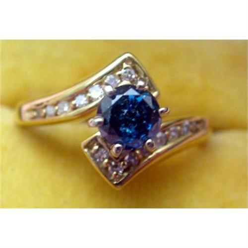 The latest trend in the jewelry industry is colored diamonds. This ring has a teal blue round diamond of .62 and .33 round white diamonds to accent the bypass design. (.95 TW diamonds) Weighs 4.2 gm of 14K YG. Stamped 14k and a trademark inside the shank.The ring is circa 80's but the blue diamond was added in 2002. It is a size 71/2 presently but can be sized by any professional jeweler. Be the first among your friends to join this fashion trend. This would make a great "Right Hand" ring to say "I've made it!" *all stone size is estimated unless the item comes with an appraisal.