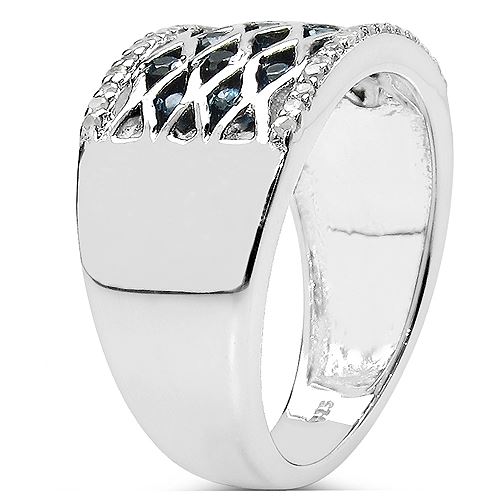This sterling silver ring has a peek-a-boo appeal with the lattice pattern, exposing the blue diamonds and the white diamonds lining the borders. There are .41 carats total weight of blue and white, round, brilliant-cut, I2-I3 clarity diamonds. The wide band is approximately 11mm at the top, tapering to a 4mm shank. The ring is US size 7.25.& nbsp; Admin: KQ86371/11ae