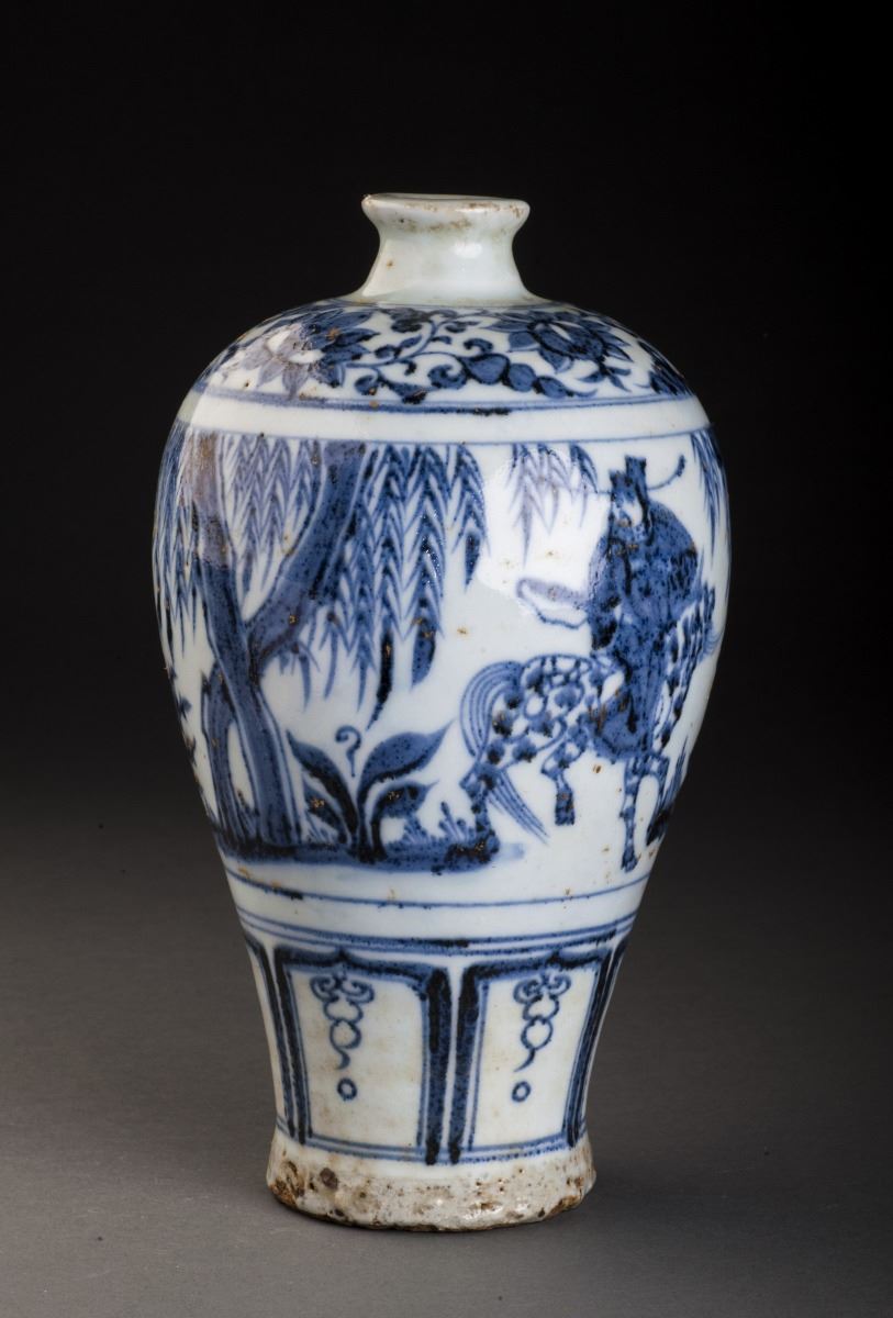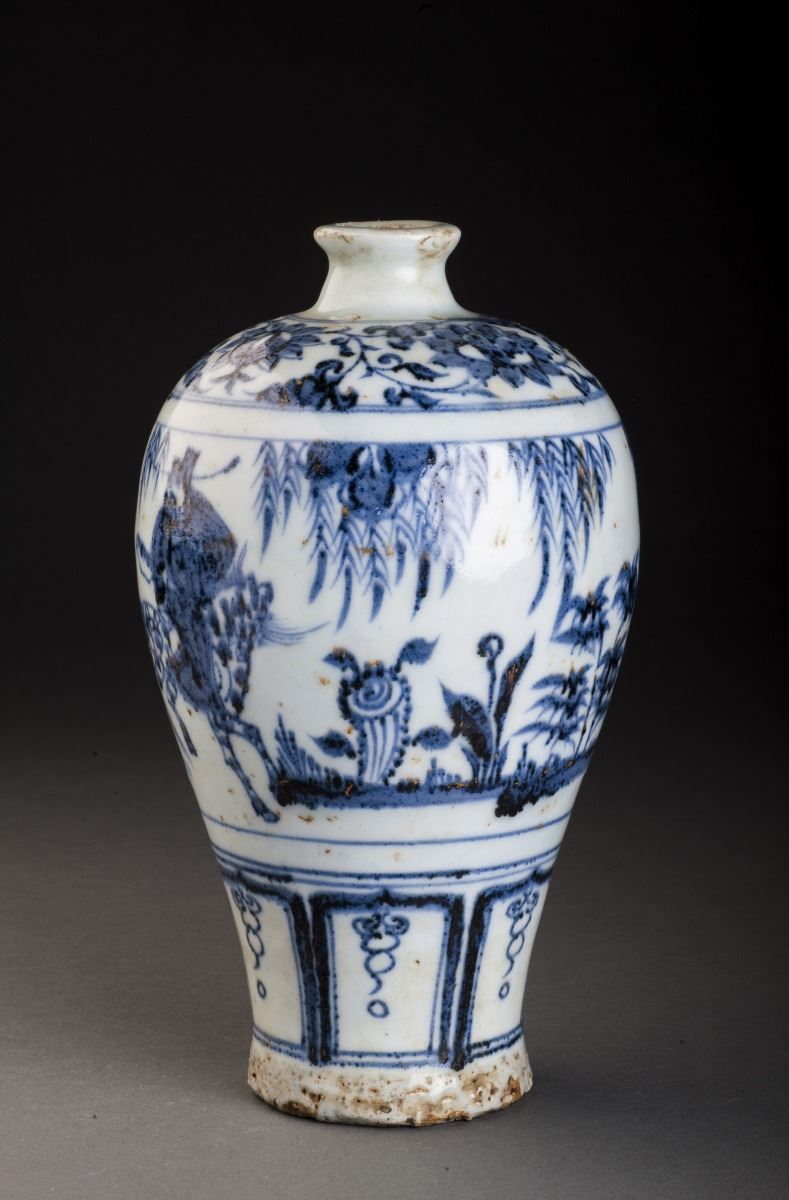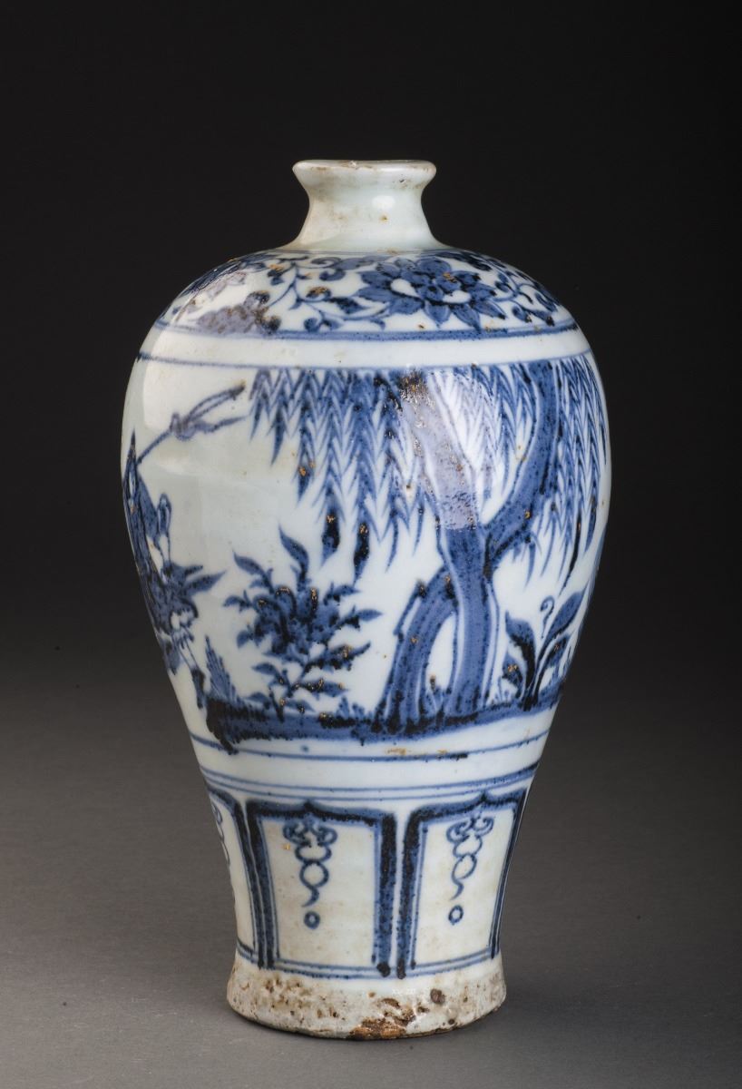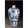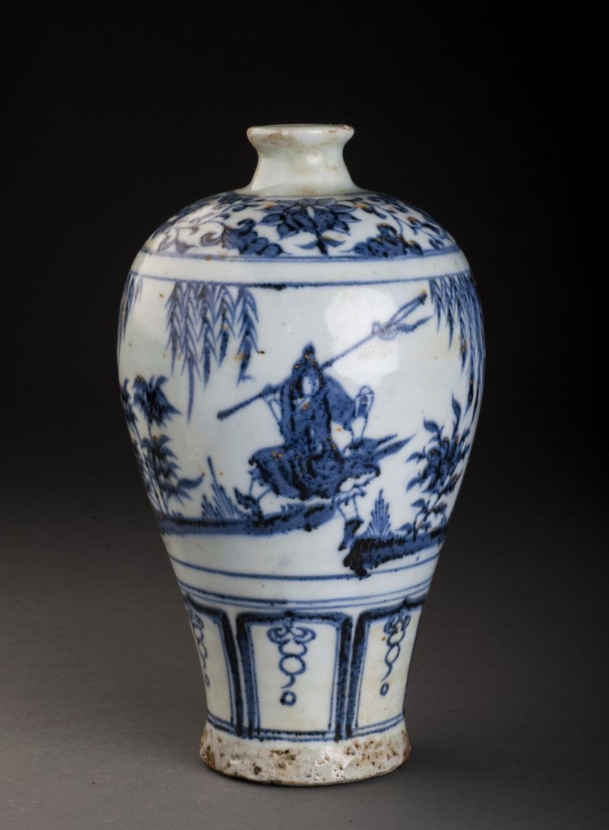 Finely Potted Globular Body With The Delicate Painted Feature Pattern. The Cavetto Amusingly Painted In Vivid Under Glaze Blue With A Continuos Scene Of A Person Holding A Long Ax And Dressed In Long Lobe, While TheOther Dignitary Riding On A Horse And Turning His Head Slightly To The Back. All Set Within A Landscape Of Trees And Flowers. Decorated With The Flower Band Around The Neck And Round Shoulders.