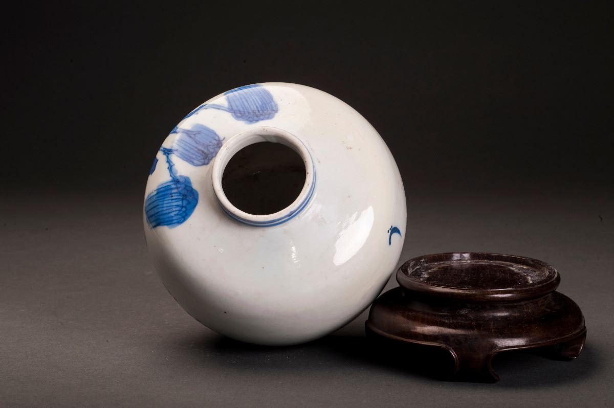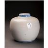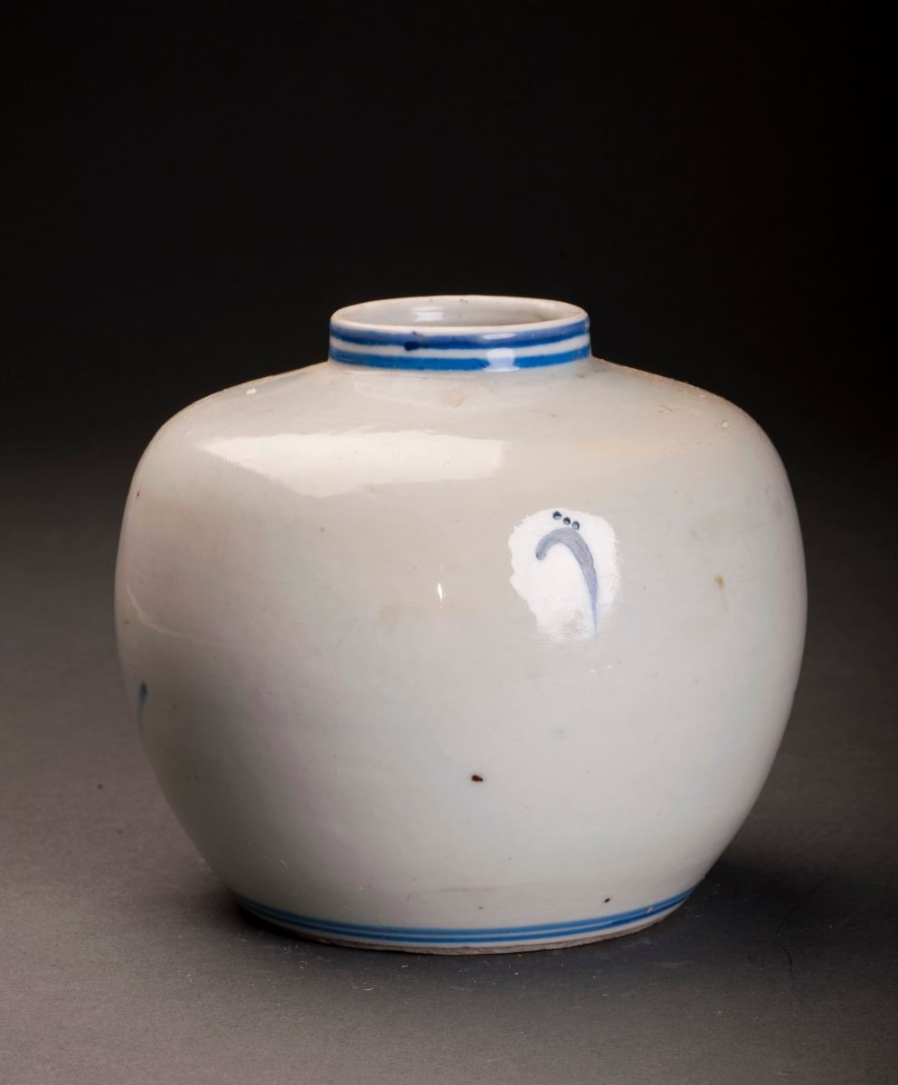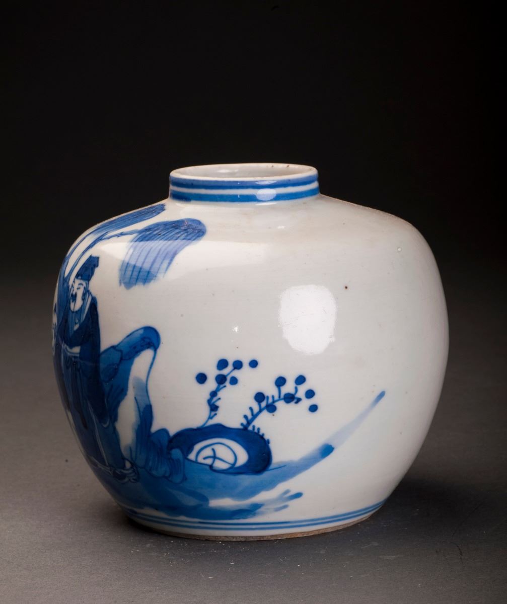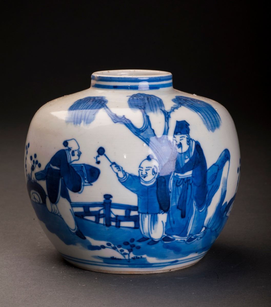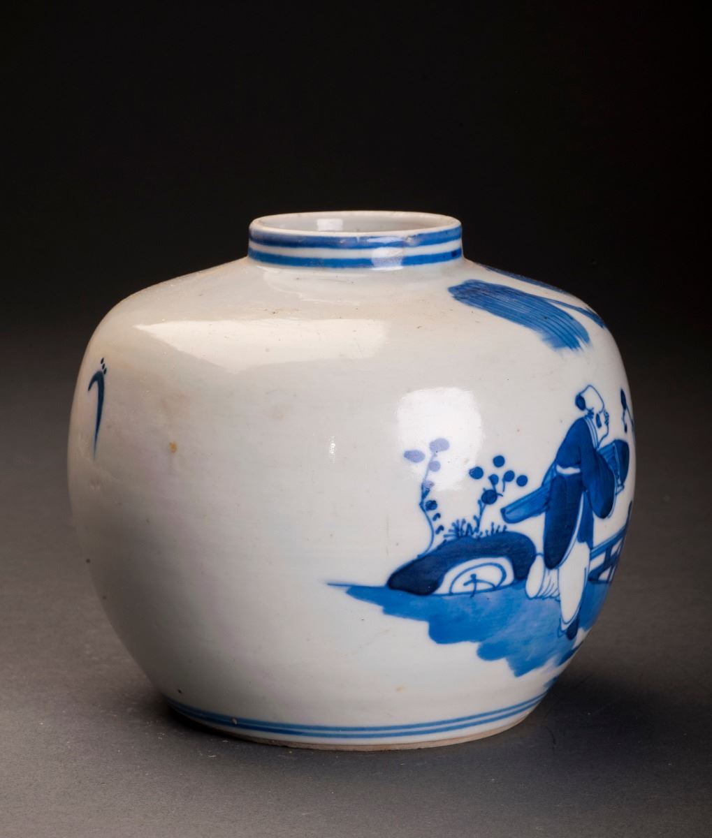 A Small Porcelain Jar In Good Condition, With Fine Blue And White Glazed Throughout. Painted With Features Patterns On The Finely Potted Body. One Gentleman Standing Under The Vivid Tree With His Grandchild, SeemsTalking To The Other Man Across The Street.